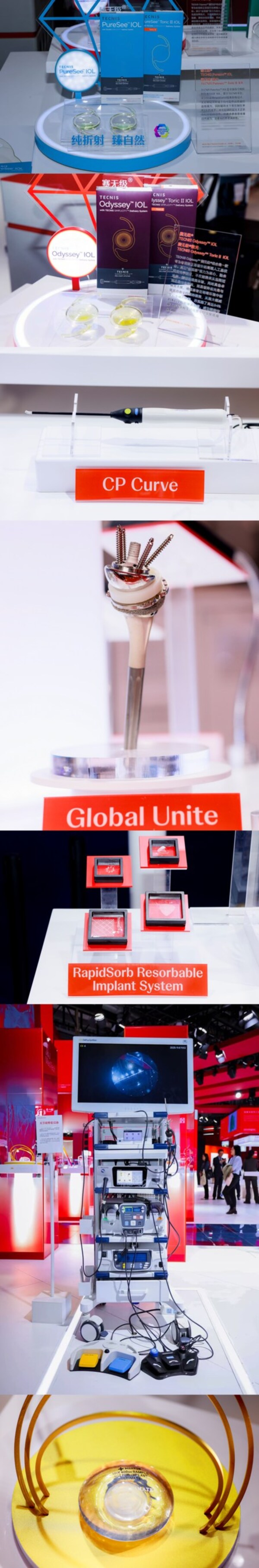 (上起:TECNISPureSee™IOL臻无级®与TECNISOdyssey™IOL赛无级®、CP系列等离子射频刀头及GlobalUnite人工肩关节系统、强生RapidSorb可吸收固定系统、关节镜整体解决方案、傲诺拉-星钻乳房植入体)
