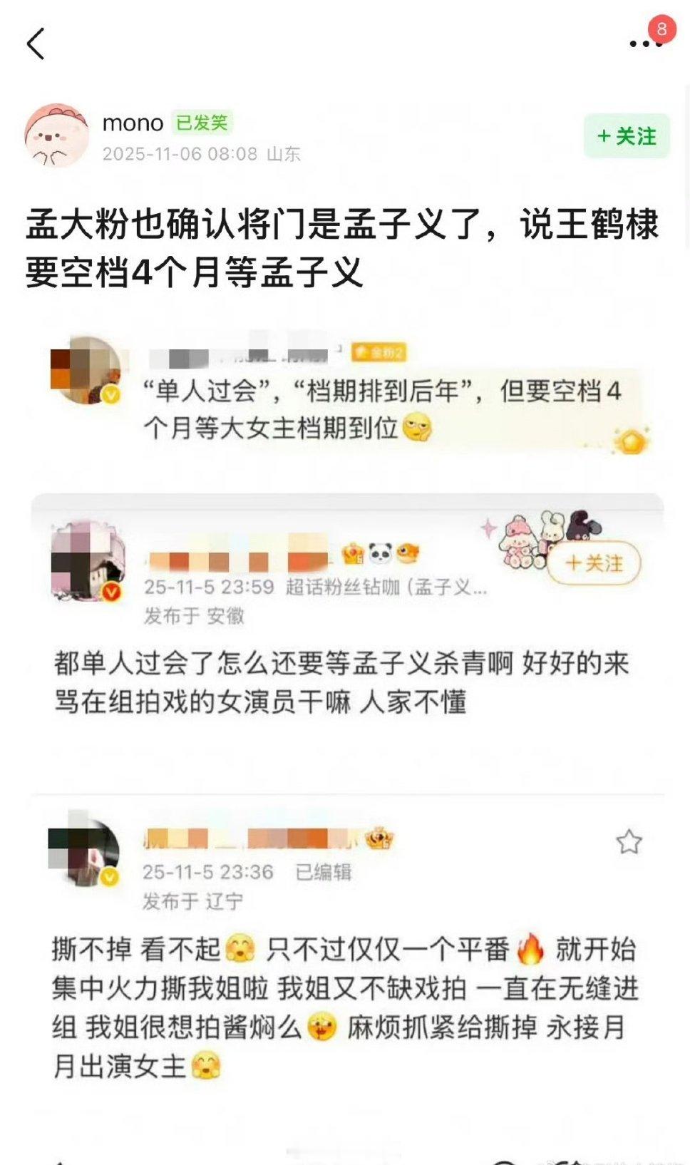 王鹤棣粉丝在永拒孟子义 看到说是鹅这边不得不开《将门毒后》这个项目,因为版权要到期了~男方定了,女方这边现在是掌握主动权的。粉丝永拒没用,是要看女方的意思,女的不想接,才有用…这很难评[傻眼]