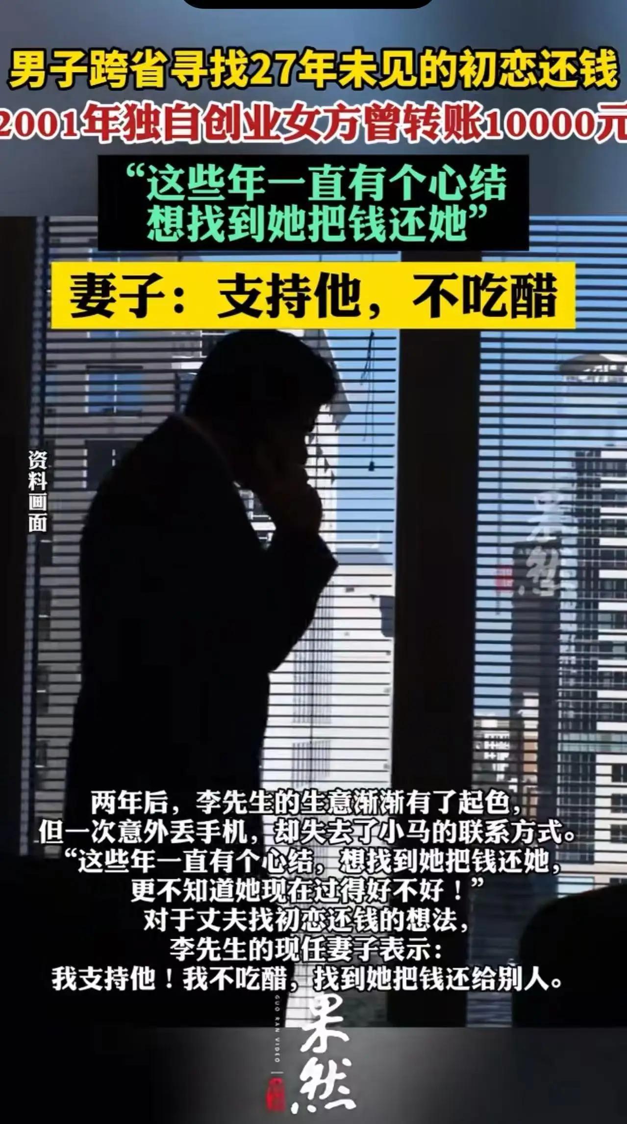 男子跨省寻找27年未见的初恋还钱!男子:“2001年独自创业时,她转账给我10000玩,这些年一直有个心结,想找到她把钱还给她!妻子:支持他,不吃醋!网友:27年前借的一万块,现在大概要还10万才行!其实就是心里还有她,就是想见见她! 男子跨省寻找27年未见的初恋还钱,这个故事看似普通,却深藏着令人动容的人性温暖和爱情的执着。或许有人会说,这不过是一场“还钱”的旅程,但细细品味,却能发现背后那份难以割舍的情感和对过去美好时光的怀念。 他说:“2001年创业时,她转账给我一万块玩,这些年一直有个心结,想把钱还给她。”简单一句话,却透露出一个男人对那段青涩岁月的珍视。27年前的那笔钱,或许只是他人生中的一段插曲,但在他心中,却是一个无法抹去的记忆。那份情感,就像一根细细的线,牵动着他多年未曾释怀的心。 他的妻子理解他,支持他,不吃醋。她知道,这不仅仅是“还钱”那么简单,更是一次对过去的告别,一次对自己青春的致敬。有人说:“这男人是不是脑袋秀逗了?跨省找人还钱,浪费时间。”但谁能理解,这背后隐藏的,是一份对青春、对爱情、对那段纯真的回忆的珍惜? 网友们的调侃也许带点调侃的味道:“27年前借的一万块,现在大概要还10万才行!”但他们忽略了一个核心:这不只是金钱的数字游戏,而是一份心意的表达。或许,这一万块在那个年代只是个小数目,但在他心中,却是对那段时光的怀念和未曾说出口的感激。 故事的真谛在于:人心深处那份对美好过去的留恋,从未真正消逝。男人的执着,是对那份纯真爱情的怀念,也是对青春记忆的尊重。或许,他只是想见见她,和她道一句“谢谢你曾经的陪伴”,然后,把那份情感埋在心底,继续前行。 这故事让我们反思:在这个快节奏、物质至上的时代,或许我们都应该学会珍惜那些曾经温暖过我们的记忆。也许,我们都曾在某个瞬间,心中藏着一份未完的情感,只等待一个合适的时机,去面对,去释怀。 这不仅是一个关于还钱的故事,更是一场关于人性、关于爱的深刻剖析。它提醒我们:人生的路上,有些人、一些事,永远不会被时间冲淡。只要心中有爱,再远的距离,也能找到回家的路。初恋 初恋追忆
