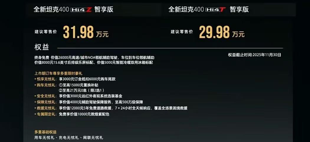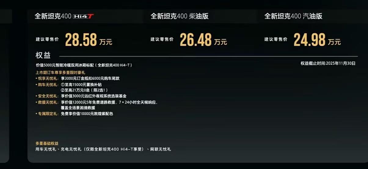 车盟快讯:今日,全新坦克400潮酷上市!此次上市共推出5款车型,官方指导价为:24.98~31.98万元;其中最为重磅的是混动系列推出的2款车型,官方指导价为万元29.98~31.98万元;限时推出6项购车权益,包括3000元享6000元尾款抵扣、免费享价值10000元的敦煌紫配色…详情见图。坦克400提供Hi4-Z、Hi4-T、汽油、柴油四大动力,是全球唯一覆盖全动力矩阵的越野SUV,满足用户的全场景出行需求。全新坦克400以星际机甲美学独树一帜,彻底冲破越野车设计的桎梏,自成机甲新流派。全新坦克400升级长城汽车第三代Coffee OS智慧空间系统,搭载行业领先的长城汽车第三代辅助驾驶系统Coffee Pilot Ultra,实现潮酷、力量、科技的完美统一。最后想问大家:如果是你选,会pick极限越野的Hi4-T版本,还是兼顾性能和日常的Hi4-Z版本?
