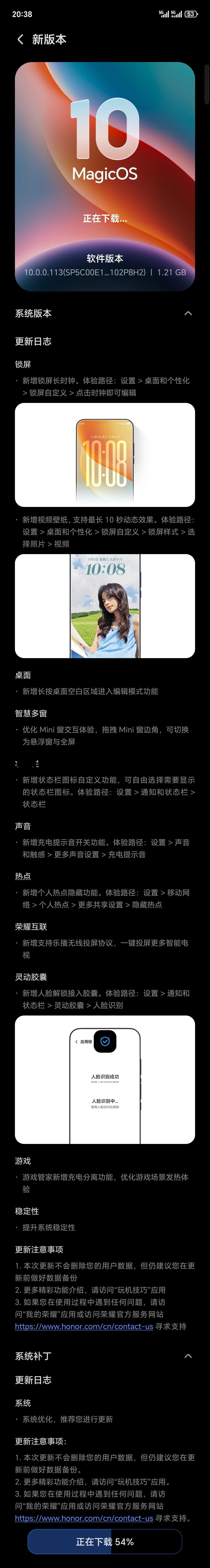 Magic7系列等机型已经推送10.0.0.113版本,大时钟0.5和自定义通知栏图标显示、人脸胶囊等已经更新