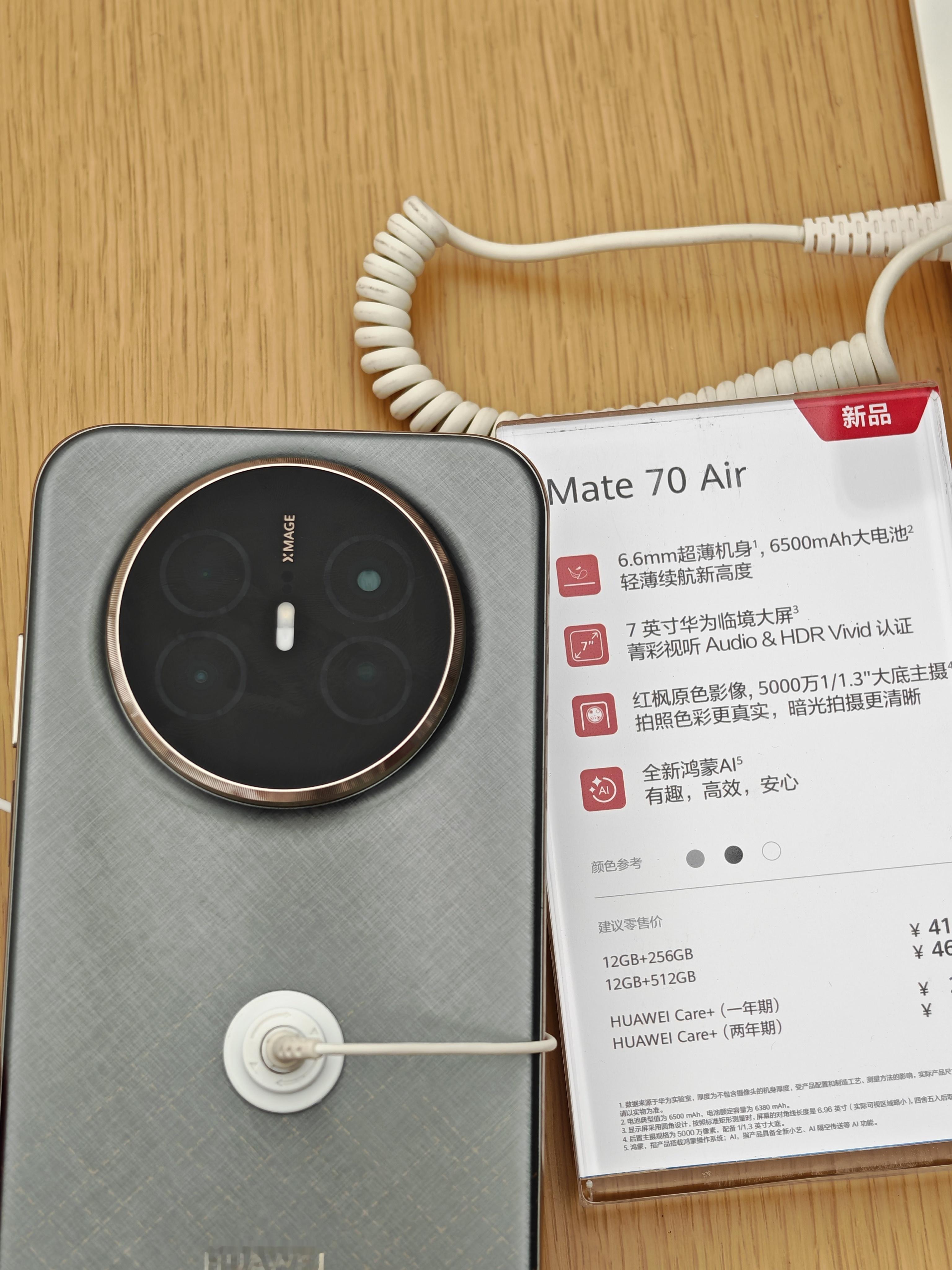 iPhone Air是想尽一切办法做的非常轻薄,虽然非常薄但是牺牲了很多配置,单摄、单扬声器、小电池等等。而华为Mate70 Air是在不牺牲关键配置的情况下做薄,红枫影像、北斗卫星通信、昆仑玻璃、IP68&IP69、6500mAh大电池这些都有,4199的起售价格也比较合理,还是相当不错的。华为Mate70Air