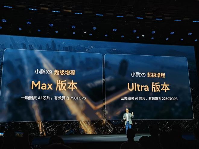 智能化方面,小鹏X9增程MAX版本搭载了一颗小鹏自研的图灵AI芯片,有效算力750TOPS,Ultra版则搭载了三颗小鹏自研的图灵AI芯片,有效算力高达2250TOPS。
