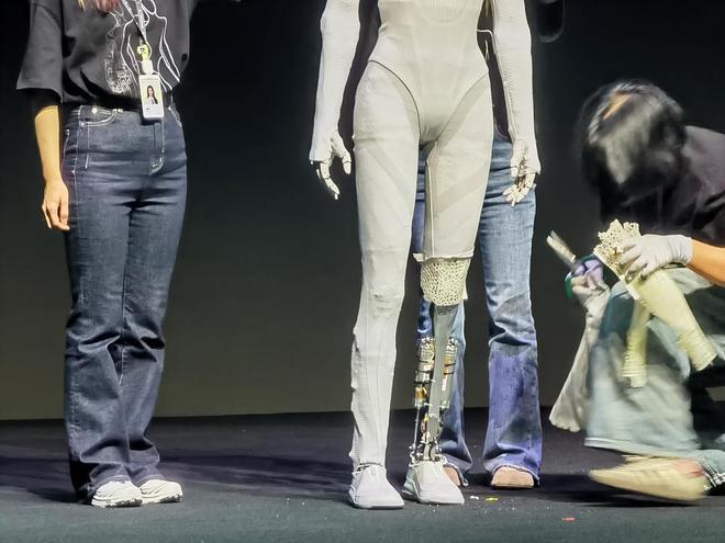 ▲小鹏机器人团队在台上剪开小鹏全新一代IRON的腿部覆盖件
