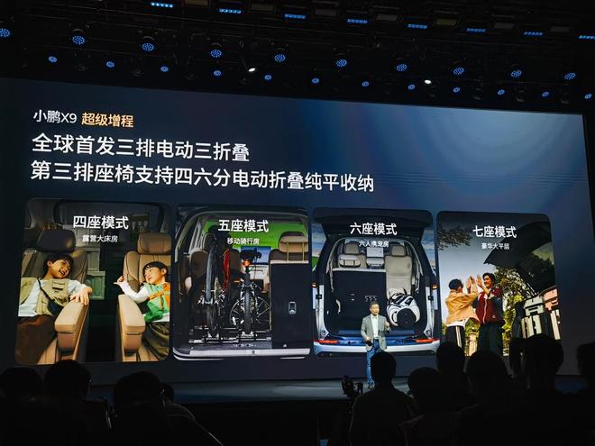 在空间方面,小鹏X9增程版拥有三排电动三折叠功能,第三排座椅支持四六分电动折叠纯平收纳,四人出行可化身露营大床房,五人出行可收纳两座并容纳两辆自行车,六人出行可收纳一座同时携带宠物,七人满座仍可装载7个24寸行李箱。