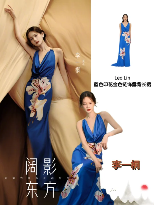 李一桐以一席Leo Lin的蓝色印花露背长裙亮相,绚丽印花绽放鲜活生命力,V领设计勾勒动人曲线,尽显东方典雅。