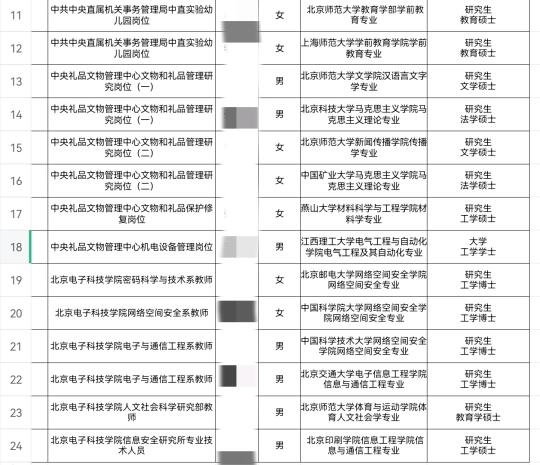 🎈名校背景集中:录用者几乎全部毕业于国内顶尖或知名高校,如中国人民大学、北京师范大学、中国科学院大学、北京理工大学、东南大学、中国传媒大学、中国政法大学、北京邮电大学、北京交通大学、中国人民公安大学等。北京高校占据绝对优势