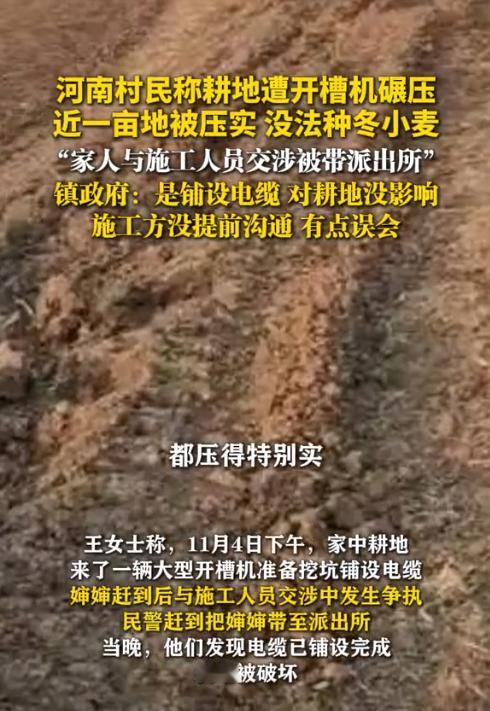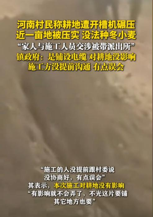 河南驻马店,一村民的自家耕地被大型开槽机碾压,近一亩地没法种小麦。可施工方却说是