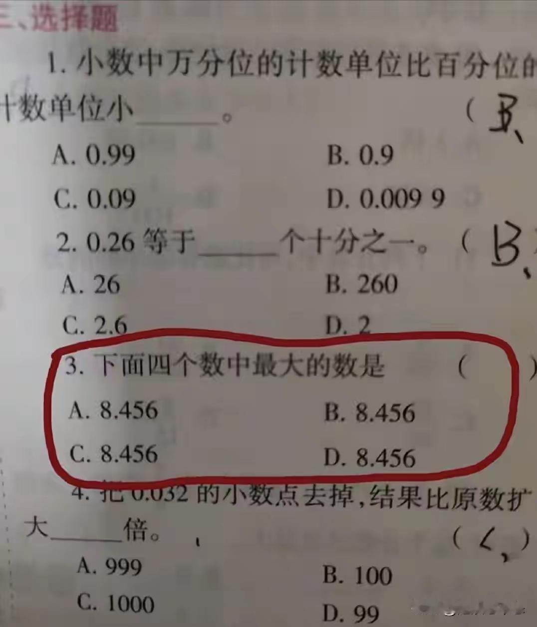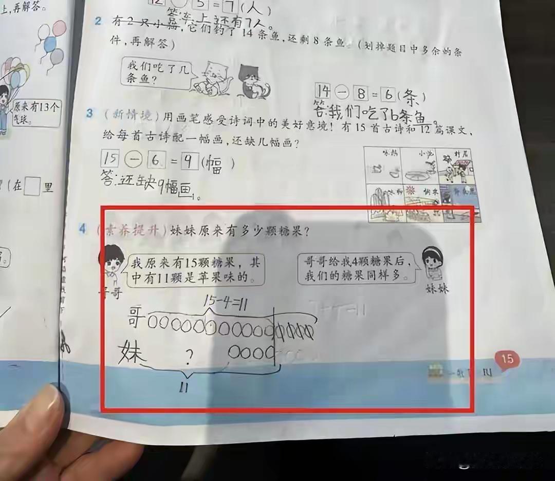 [赞]现在的数学思维题真是让家长没了一点脾气。 6加2不是8难道是7? 李女士拿着儿子被打红叉的作业本,气冲冲闯进班主任办公室,可老师指着题目图片的一句话,让她瞬间哑口无言。李女士是重点大学毕业,平时辅导上二年级的儿子写作业,总觉得“小菜一碟”。直到看到儿子作业本上那道“岸上6只鸭子,水中2只,共几只”的题目,她彻底懵了,儿子写的“6+2=8”被画了红叉,旁边还写着“全班仅错这一道”。 “肯定是老师批改马虎了!”李女士第一时间没怀疑自己,反而觉得是老师看错了数字。 李女士虽然心里不舒服,但也没当场发作,毕竟老师是教孩子的专业人士。她平时为人处事向来稳重,没想到这次竟然遇到这种“奇葩”的题目,心中充满了疑惑。她捏着作业本,站在班主任的办公室里,仿佛站在了一个数学难题的前面。她想,难道是我错了?我教孩子这么多年,6加2不就是8吗?不管怎么说,她心底里还是有点不敢相信自己的眼睛。 班主任看着李女士困惑的神情,微微一笑,指着题目上的说明说:“这道题目是考察孩子们的数学思维,而不是单纯的加法。鸭子虽然在岸上和水里,但它们是不同的空间,不能直接加起来。题目的核心在于‘分别计算每个空间里的鸭子数量’。”李女士愣住了,眼前的世界突然变得有些模糊。老师的话似乎是在提醒她,这并不是单纯的数学计算,而是需要通过观察和思考来理解问题的本质。 李女士当时有些不敢相信,这种看似简单的数学题,竟然蕴藏着如此深奥的思维技巧。她心里开始产生了疑问:现在的教育到底是怎么了?每道题目都设计得像个谜题,让家长和孩子都迷惑不已。李女士脑海中闪过一个念头,难道现在的数学教学,已经不再是让孩子掌握基础的知识,而是要培养孩子的“思维方式”? 其实,这种问题并不是个例。越来越多的家长和孩子都开始在面对这些“思维题”时感到困惑。这些题目看似简单,却往往隐藏着各种逻辑陷阱和复杂的思维方式,迫使孩子们跳出传统的框架,去做出一些超出他们年龄的推理和判断。正是因为这种不容忽视的变化,才让很多家长感到茫然。 李女士在反思的同时,也开始质疑这些题目的教育意义。毕竟,数学不应该是一门让孩子们感到痛苦的学科。它应该是建立在基础知识上的,通过层层递进的教学,让孩子们在学习中获得成就感,而不是不断地陷入一个又一个的思维迷宫中。尤其是对于年纪较小的孩子来说,他们的思维方式还没有完全发展成熟,过于复杂的题目可能会让他们产生对数学的恐惧感,甚至扭曲他们对学习的认知。 更让人不安的是,许多家长和老师也并没有意识到这个问题。家长忙于工作,平时并不太有时间去了解教学大纲的细节;而老师则因为教学任务繁重,难以逐一解释每道题目的设计初衷。于是,家长和孩子们只能在压力中徘徊,找不到出口。 回到李女士身上,在她离开班主任办公室后,她心情复杂,回到家中,依然在心里思考这个问题。她开始更加关注儿子的作业,发现许多类似的题目让她感到无法理解,甚至有些恼火。她决定和丈夫一起商量,是否要与老师沟通一下,看看能不能改进这些题目,帮助孩子们真正理解数学,而不是让他们陷入无谓的思维迷阵。 然而,也有一些人认为,现在的数学题设计确实有它的必要性。毕竟,教育的目的不仅仅是让孩子掌握基本的技能,还要培养他们的批判性思维、解决问题的能力。很多教育专家认为,数学的学习应该是一个综合的思维训练过程,它需要学生动脑筋、推理和分析,而不仅仅是机械地记住公式和定理。这种类型的“思维题”或许正是为了让孩子们提前接触更高阶的思维模式,锻炼他们的解题能力。 但是,不可否认的是,这种改变在短期内给家长和孩子们带来了不小的困扰。家长们的压力变大了,孩子们的学习焦虑也在不断加剧。大家纷纷提出疑问:是否教育的初衷已经偏离了?我们究竟是在为培养“思维能力”而设计题目,还是让孩子们在不断的迷茫中迷失了方向? 各位读者你们怎么看?欢迎在评论区讨论。