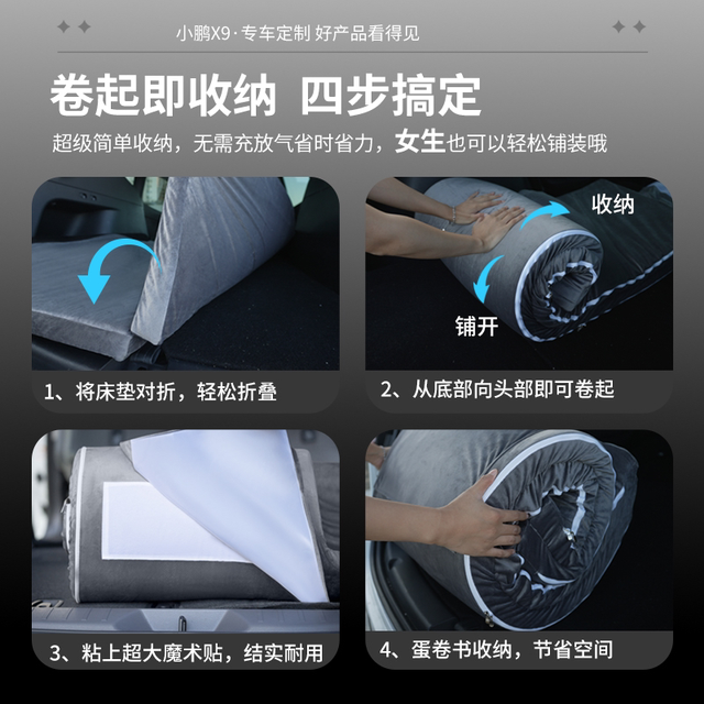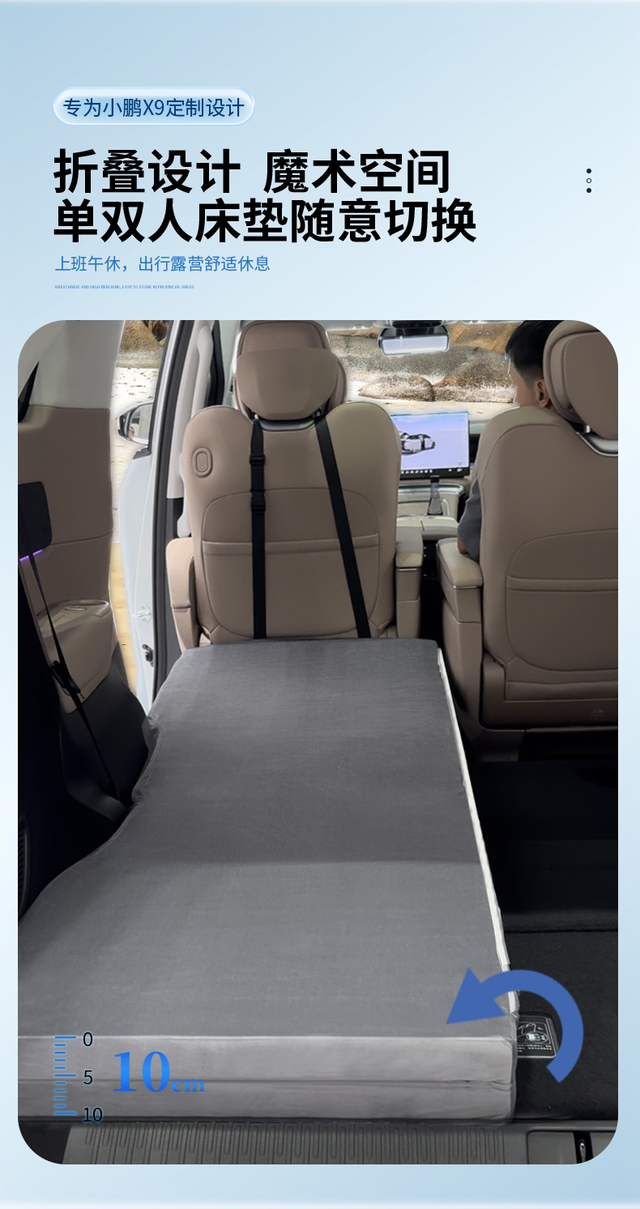 心仪的小鹏x9床垫 某宝看到小鹏X9专用床垫、非常贴合、乳胶床垫非常舒适、前方配有延伸支撑硬板、使床垫长185都有支撑、床垫收放都非常快捷,还配有精美收纳包。