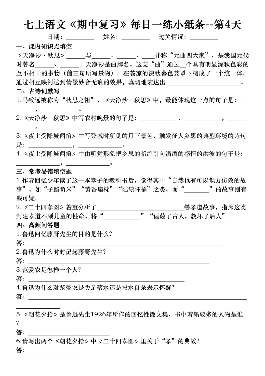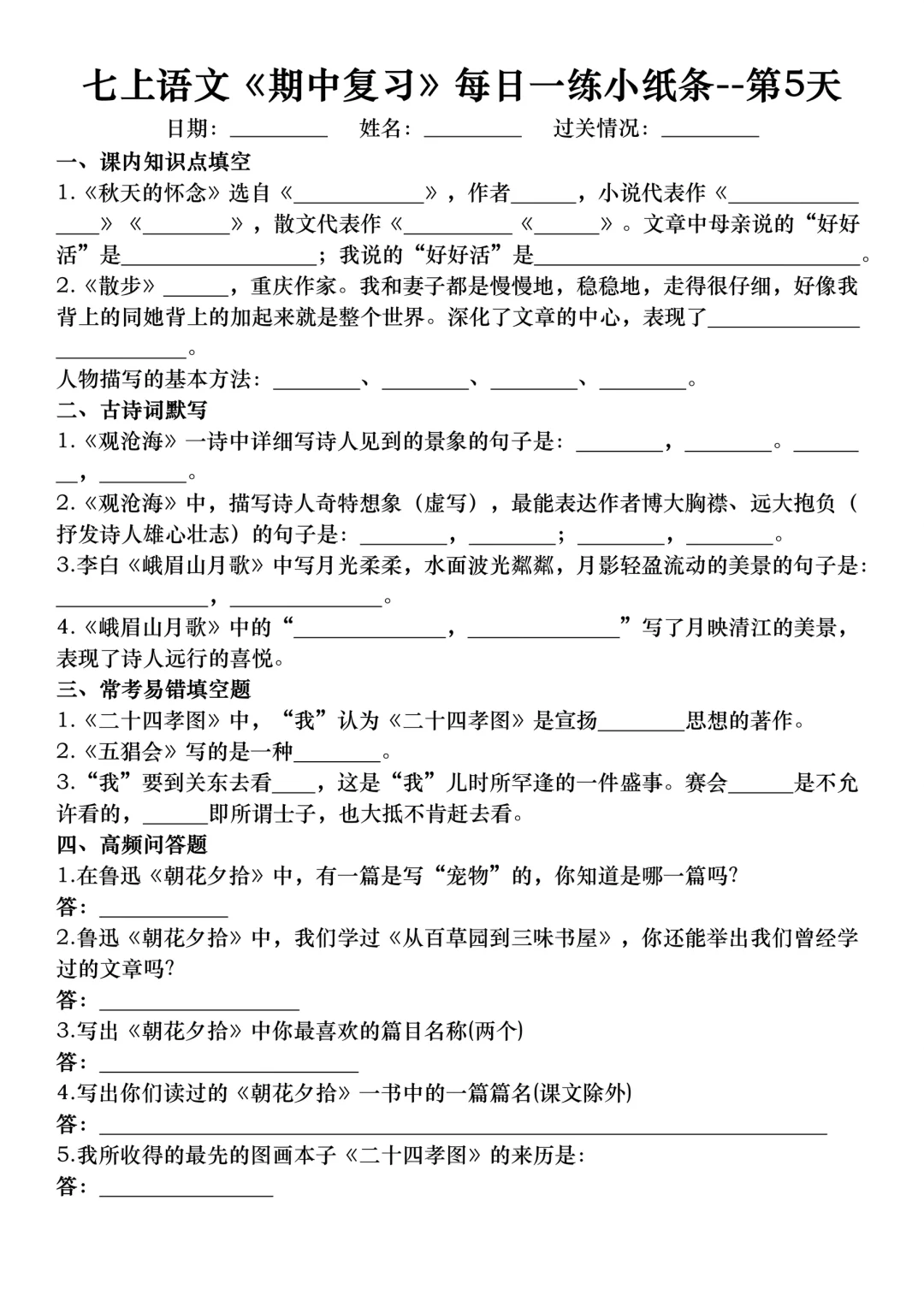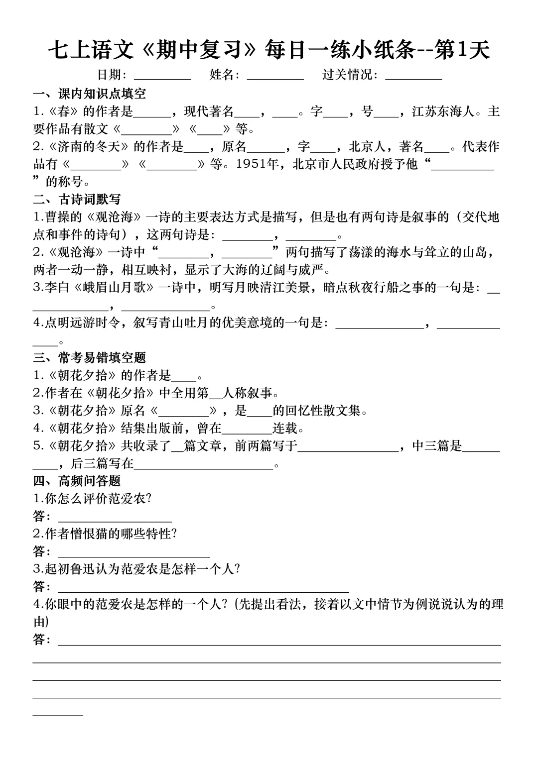 七年级上册语文期中考试复习考点专项练习