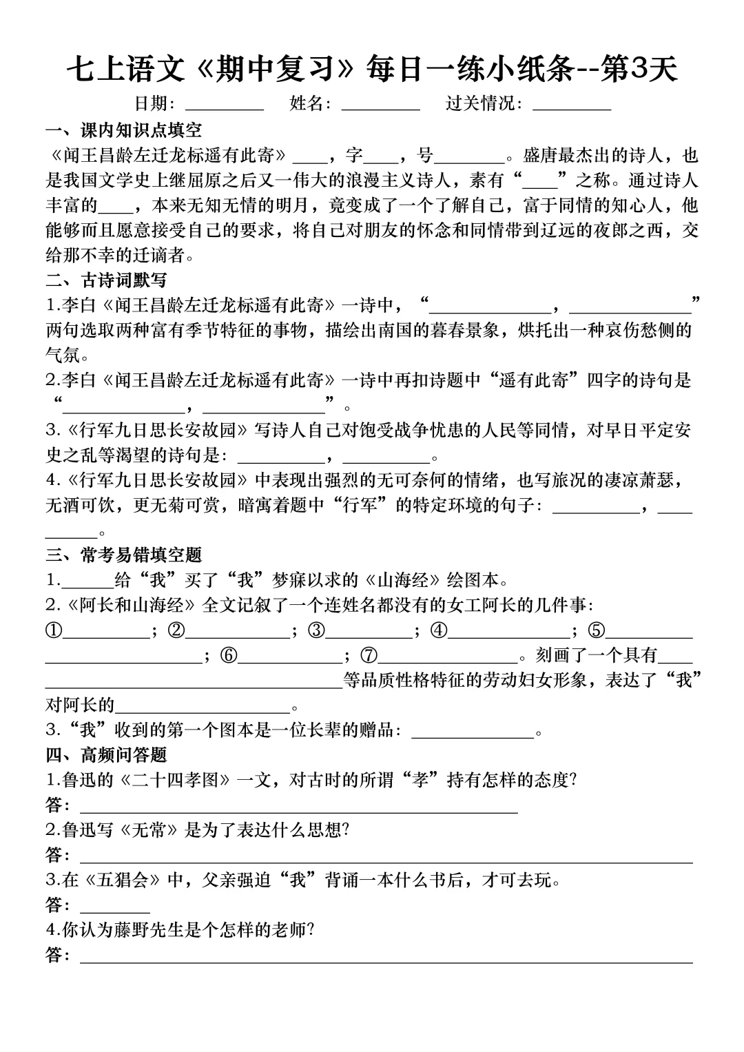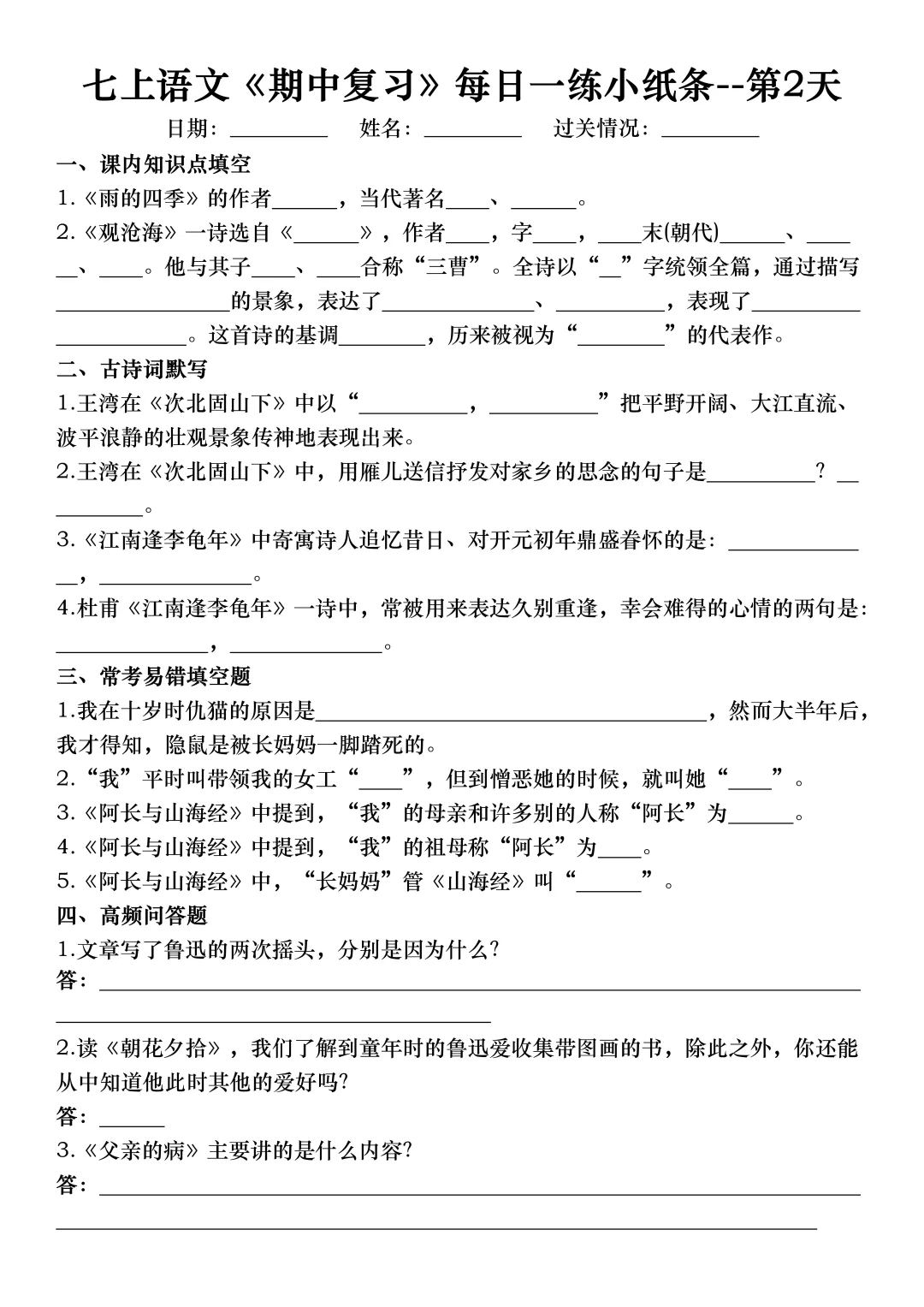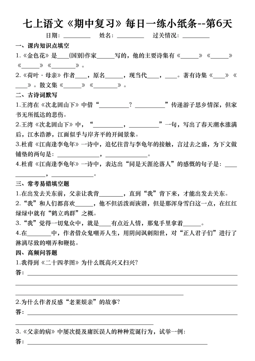 七年级上册语文期中考试复习考点专项练习