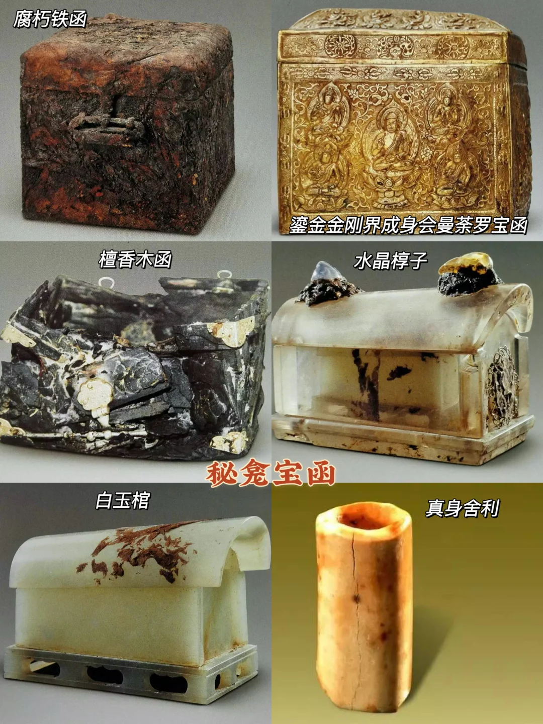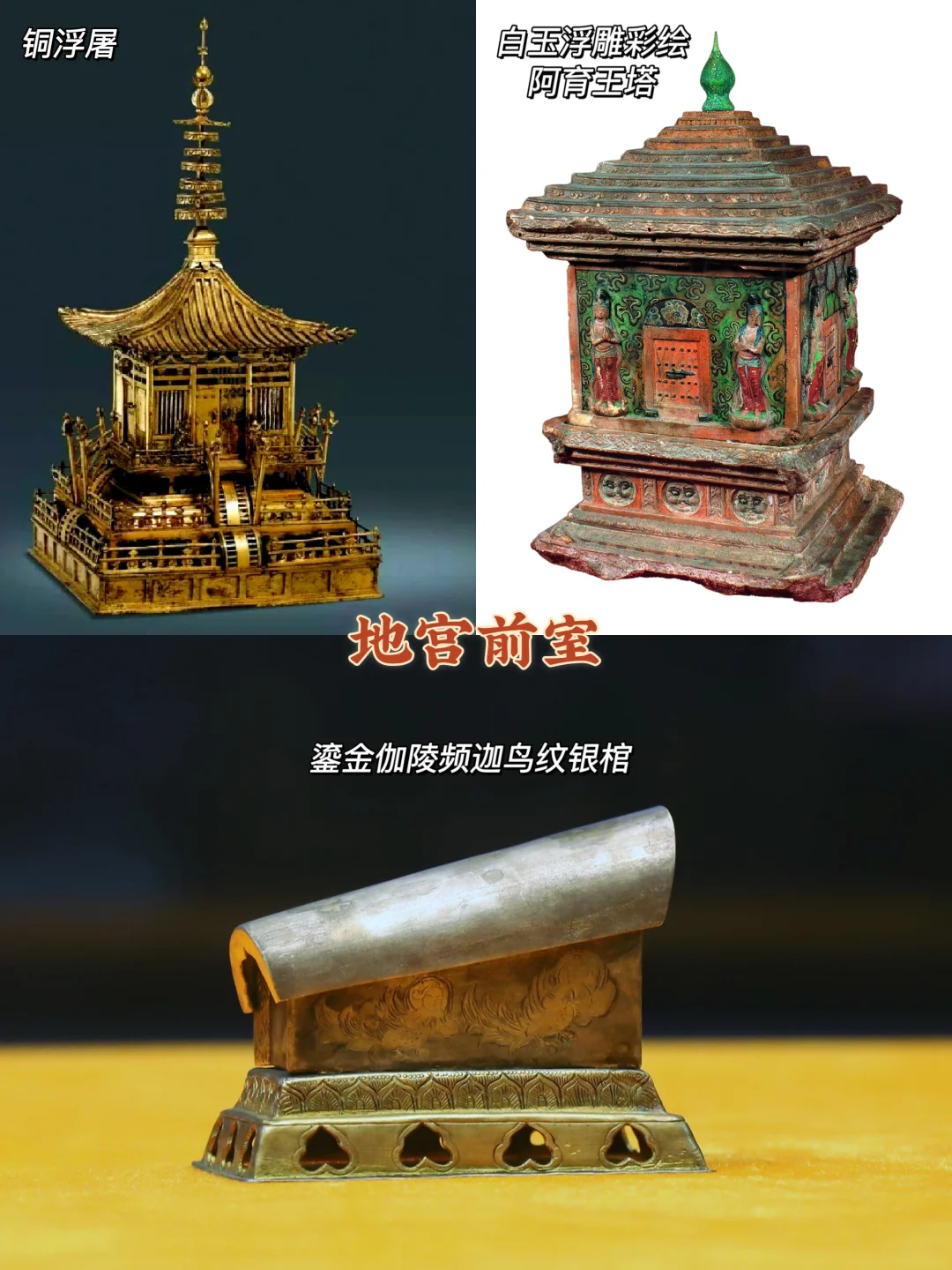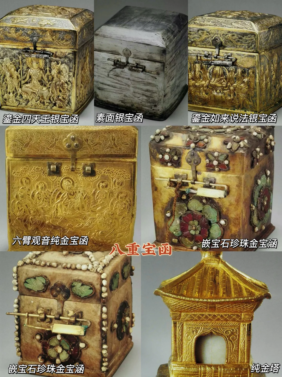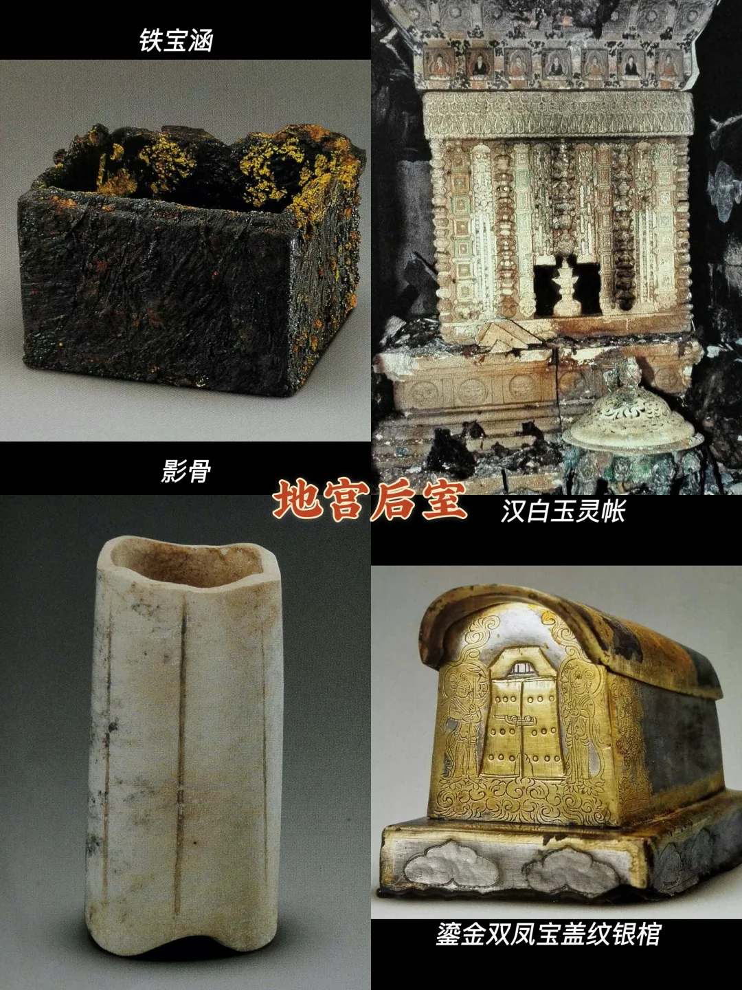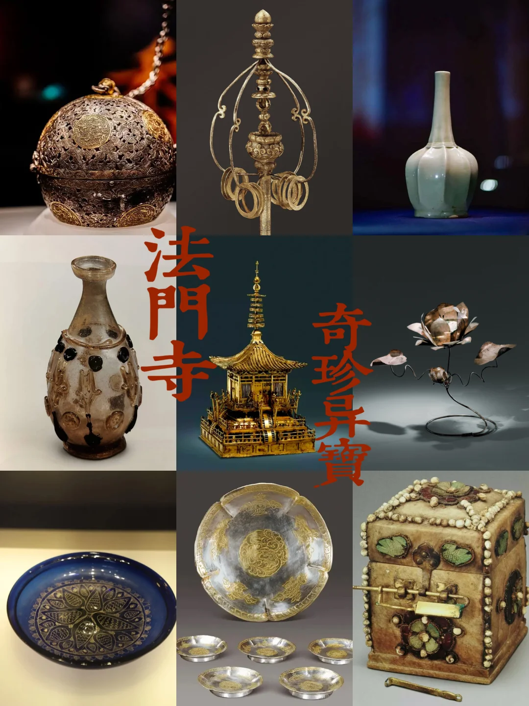 🔹如今位于陕西宝鸡扶风县的法门寺始建于东汉桓帝年间,原名为“阿育王寺”,供奉着释迦摩尼的佛指骨舍利。 自北魏开始,这里不断扩建,即便经历过数次灭佛损毁,依旧在唐代成为皇家寺院,并拥有了新名字“法门寺”。 法门寺之塔修于唐代,后于明代倒塌重建,80年代这里因暴雨坍塌,人们在清理塔基时,从石缝中发现闪闪金光,于是唐代地宫重见天日。 🔹通往地下的台阶铺满了“开元通宝”铜币,第一道门为巨大的朱雀门,里面立有石碑,记录着法事和供奉物信息。 第二道门后为地宫前室,地上堆砌着唐代皇亲国戚们的衣物,镶嵌着珍贵的金银丝和珠宝。 正中安置着白玉浮雕彩绘阿育王塔,塔周刻有菩萨、金刚力士、菩提树等图案,展现出盛唐雕饰水准。 而塔内的铜浮屠,则存放着鎏金伽陵频迦鸟纹银棺,一枚影骨舍利正安睡于此。 🔹第三道门后为中室,首先映入眼帘的是武则天时期所造的汉白玉灵帐,它饰有千姿百态的人神浮雕像和彩绘花纹,帐内铁函还装有影骨舍利。 之后在一个檀香木匣里,人们又发现了13件秘色瓷,包含了7只碗和6枚碟,如冰似玉、绿云染春,证实了该瓷种的真实存在。 🔹第四道门后便是后室,这里汇聚了众多珍宝,有各类金银宝器,包含了鎏金卧龟莲花纹银香炉、鎏金银香囊、‌银芙蕖、鎏金龟形银盒、迎真身银金花十二环银锡杖等。 也有完整的唐代金银茶具,像是银笼子、风炉、茶槽子、碾子、茶罗子、匙子等器物,呈现出唐僖宗的茶道爱好。 此外,还有20件琉璃器皿,其中18件都具有典型的东罗马或伊斯兰风格,可见丝绸之路的贸易繁盛。 🔹另一备受瞩目的宝物是八重宝函,分别为檀香木函(已残破)、四天王银宝函、素面银宝函、坐佛银宝函、六臂观音金宝涵、嵌宝石珍珠金宝涵、仿玉石函以及纯金塔,塔内便供奉着影骨舍利。 位于后室下方,还有一个秘龛,这里便是佛祖真身舍利所在地,而其余影骨舍利,均为玉石或佛家七宝仿制。 它被储存于五重宝函内,第一重是已腐朽的铁函,第二重是鎏金金刚界成身会曼荼罗宝函、第三重为檀香木函、第四重是嵌宝石水晶椁子、第五重为白玉棺。 法门寺地宫是世界上迄今为止发现年代最久、规模最大、等级最高的佛塔地宫,当它被打开的那一瞬,人类对永恒的不朽追求,便重新焕发出光芒。