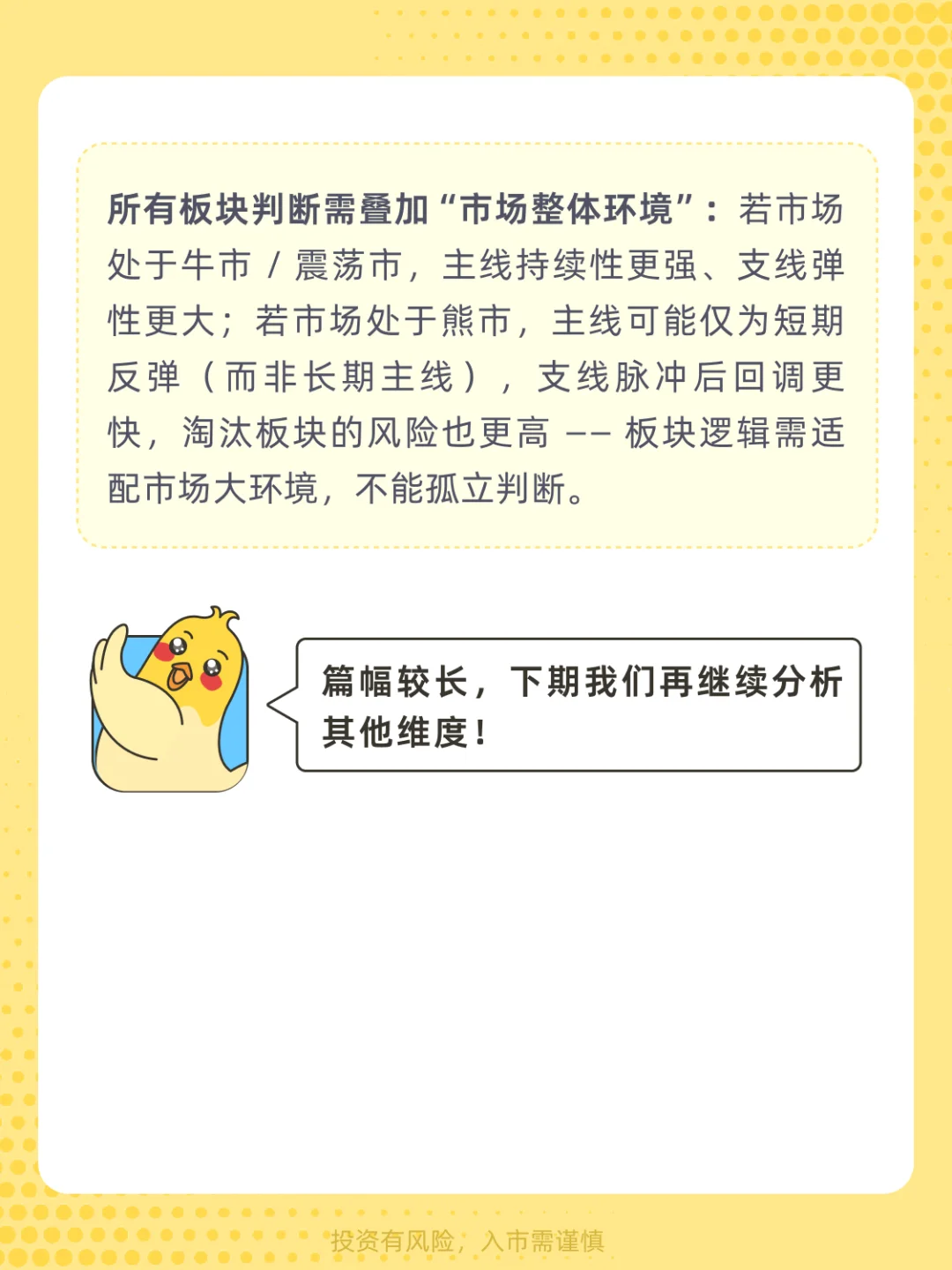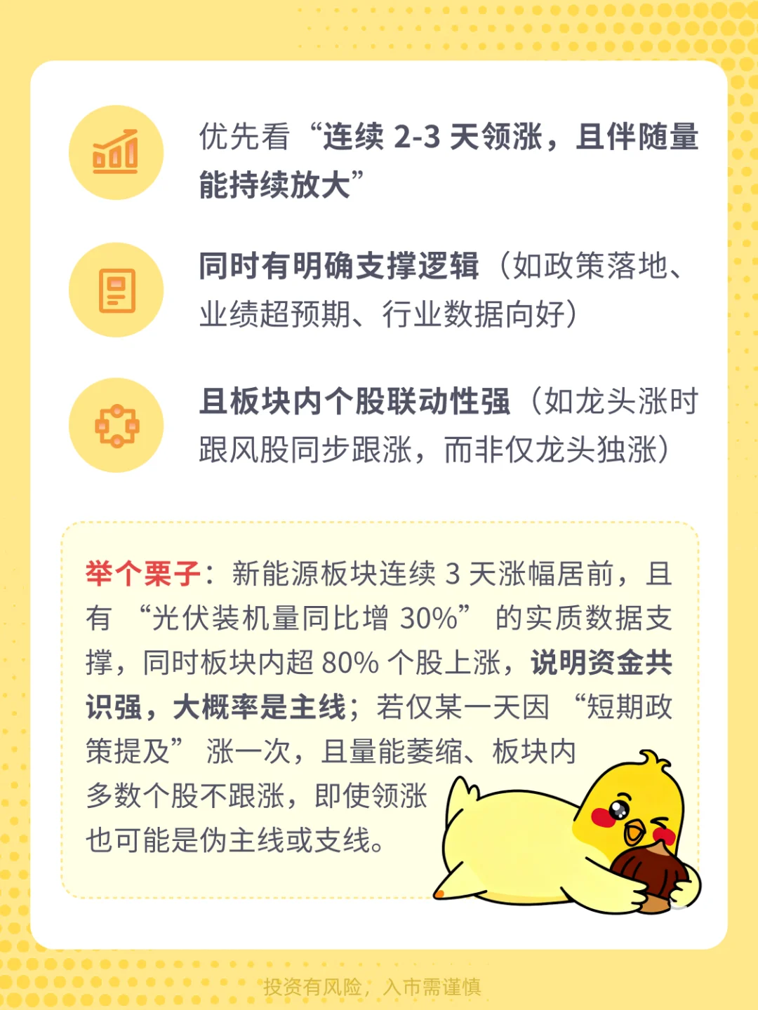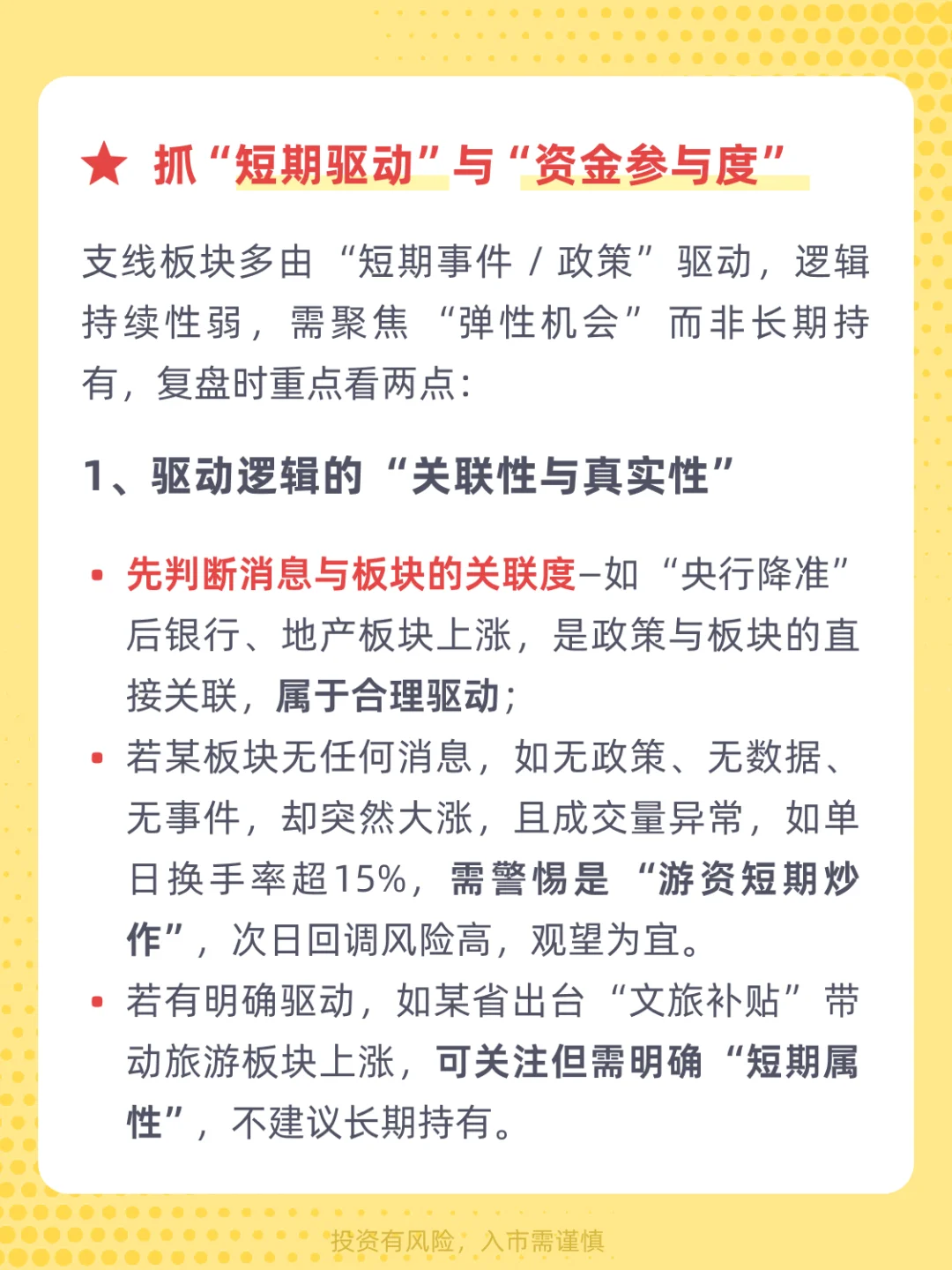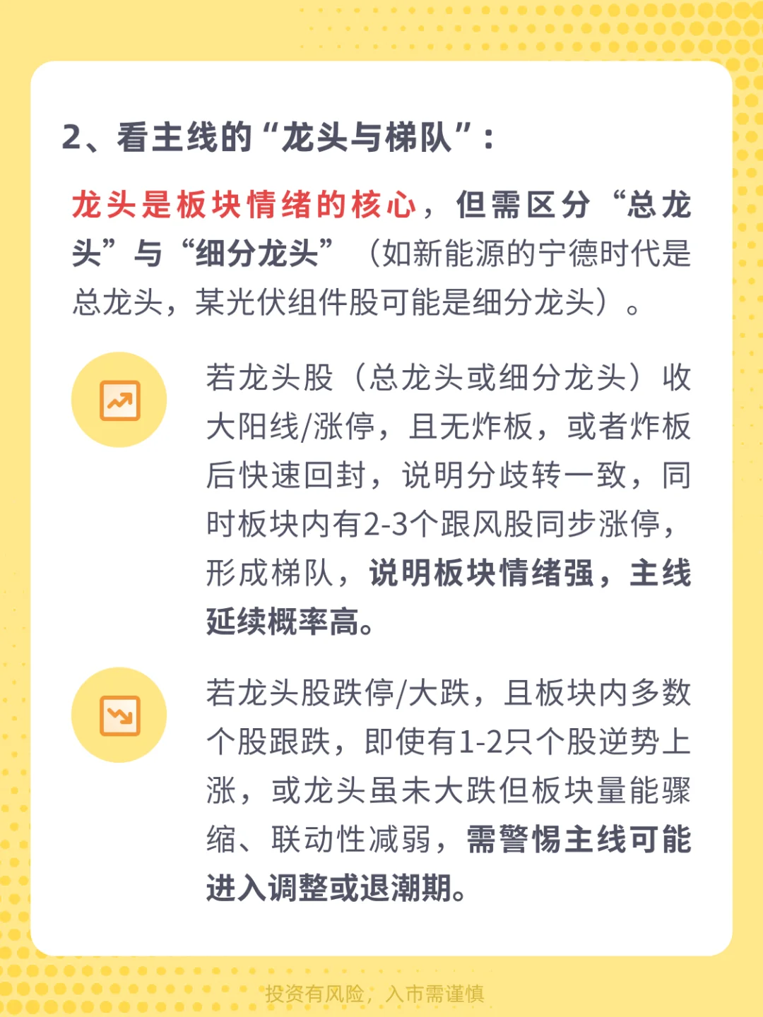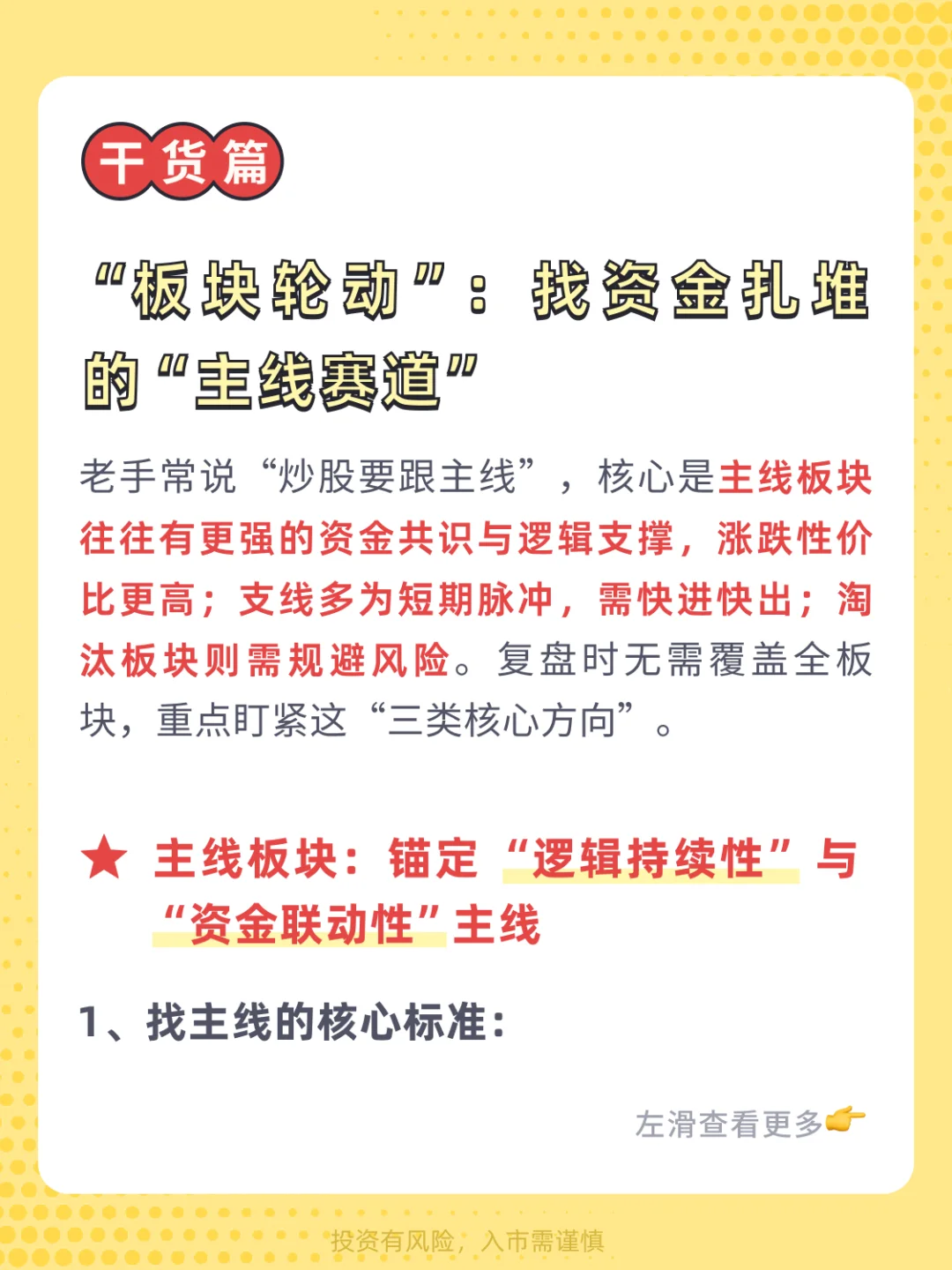 [萌萌哒R]宝子们,上期我们介绍了如何进行“大盘分析” [派对R]今天我们继续来学习如何复盘, 📈老手常说“炒股要跟主线”, 💵核心是主线板块往往有更强的资金共识与逻辑支撑,涨跌性价比更高; 💡支线多为短期脉冲,需快进快出; 📝淘汰板块则需规避风险。 🧐复盘时无需覆盖全板块, 重点盯紧这“[三R]类核心方向”。 👉一起来看看怎么找“主线”吧!