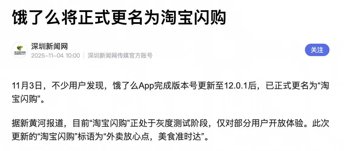 饿了么恐怕要遭殃?别急,这事只是水到渠成的升级。 最近,网上关于“饿了么改名淘宝闪购”的讨论挺热闹,有朋友说饿了么这是要被并入淘宝闪购了?也有朋友说改名字是不是意味着品牌要被资本做局了? 别着急唱衰,这事没有那么舆论那么悲观。 咱先说个事实,就是现在的饿了么已经不是那个只会送外卖的平台了,像买药、买菜、买数码、买奢侈品……只要是能立刻送到家的,饿了么都能干,妥妥转变成了一个即时零售平台。 再结合着看这几年阿里推行的大消费战略,说白了,就是想把“想买就买、立刻送达”这件事变成一种生活方式。 饿了么这么多年下来商家的增加,骑手网络的搭建,用户信任的积累,本身底子就够硬,搭配上淘宝闪购的品牌效益,这不就是一加一大于二的合作吗? 数据不会说谎,淘宝闪购这边日订单峰值已经冲到1.2亿,活跃骑手200多万,说明这个方向没错,只要资源能整合得更好、玩法逻辑够清晰,对用户和对商家就都是好事,叫什么名字并不重要。 所以现在的局势很明了:饿了么站在了时代最好的位置上,一切的发生既是谋略已久的布局谋划,也是水到渠成的升级进步。 所以要我说,无论改不改名,这都不会是饿了么的“结束”,可能是它“更强”的开始。