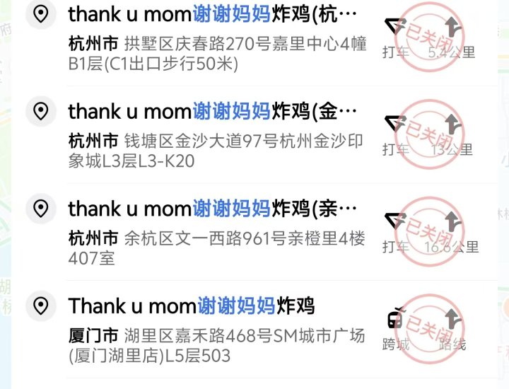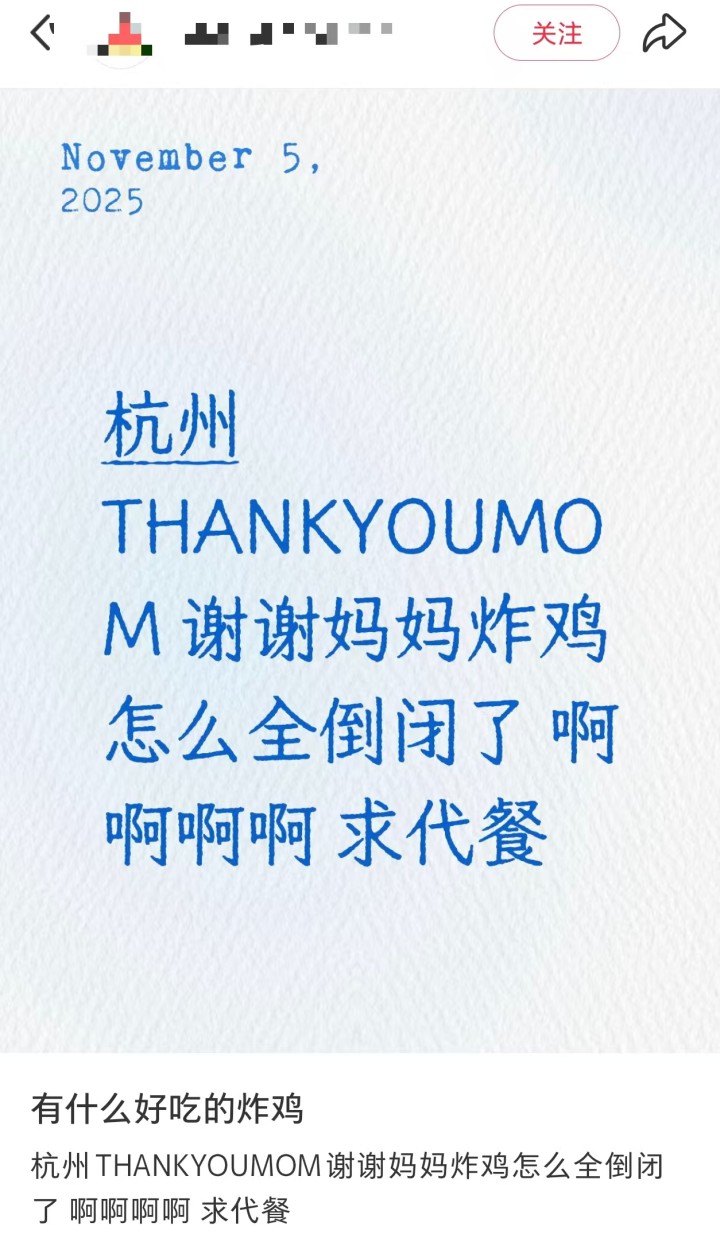 最近在社交平台上,有网友发帖称Thankumom谢谢妈妈炸鸡杭州门店全部关闭,引发了不少网友感慨。