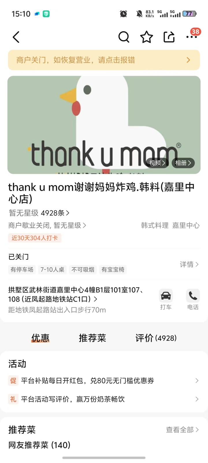 在团购平台上查看Thankumom的杭州门店,其他店已经查无此店,嘉里中心的门店也已经是歇业关闭状态。