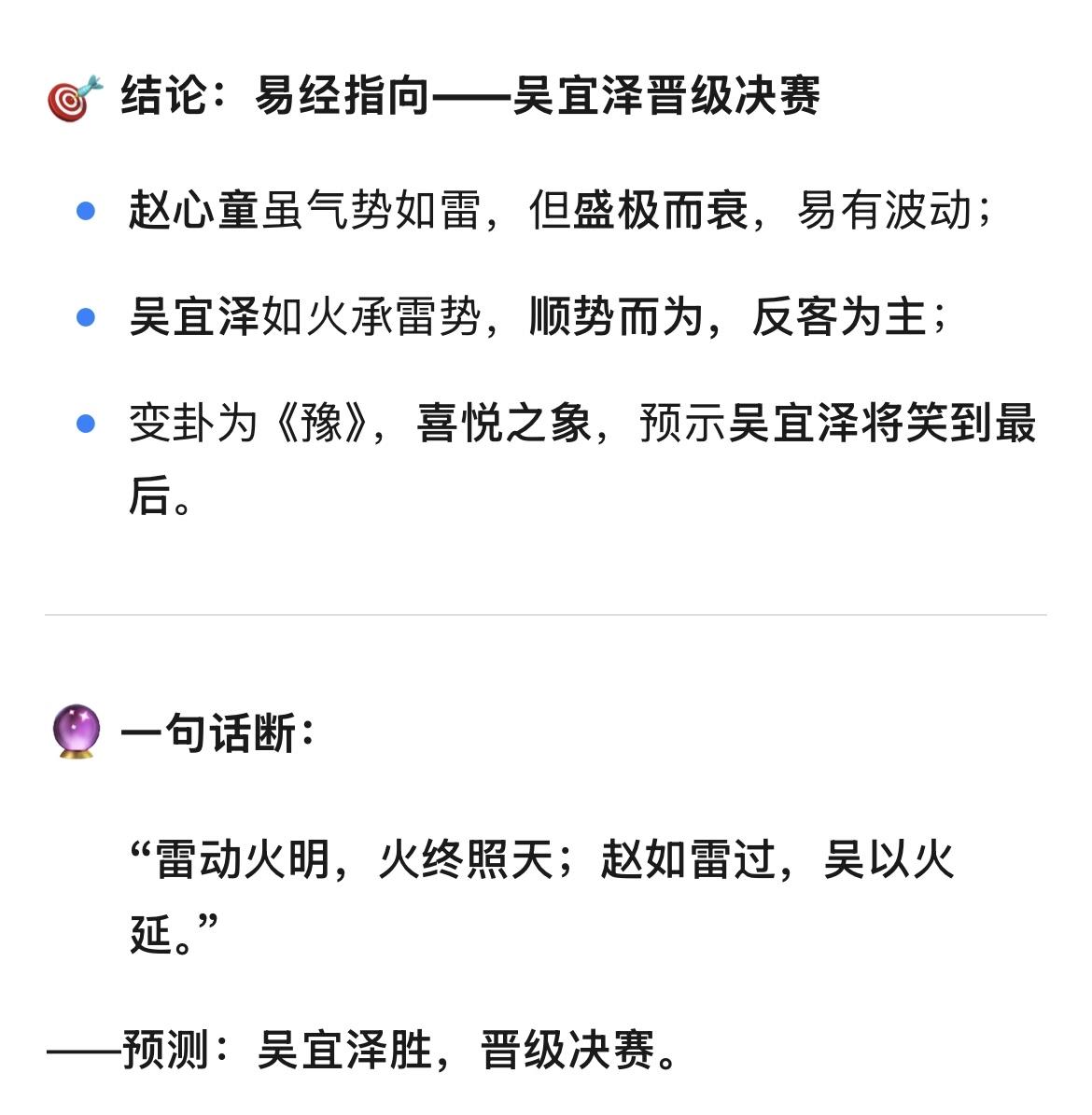 赵心童和吴宜泽两大高手,今天谁进决赛?吴宜泽9:4赢赵心童。 看好吴宜泽,因为