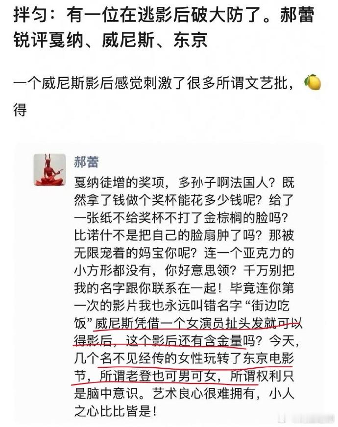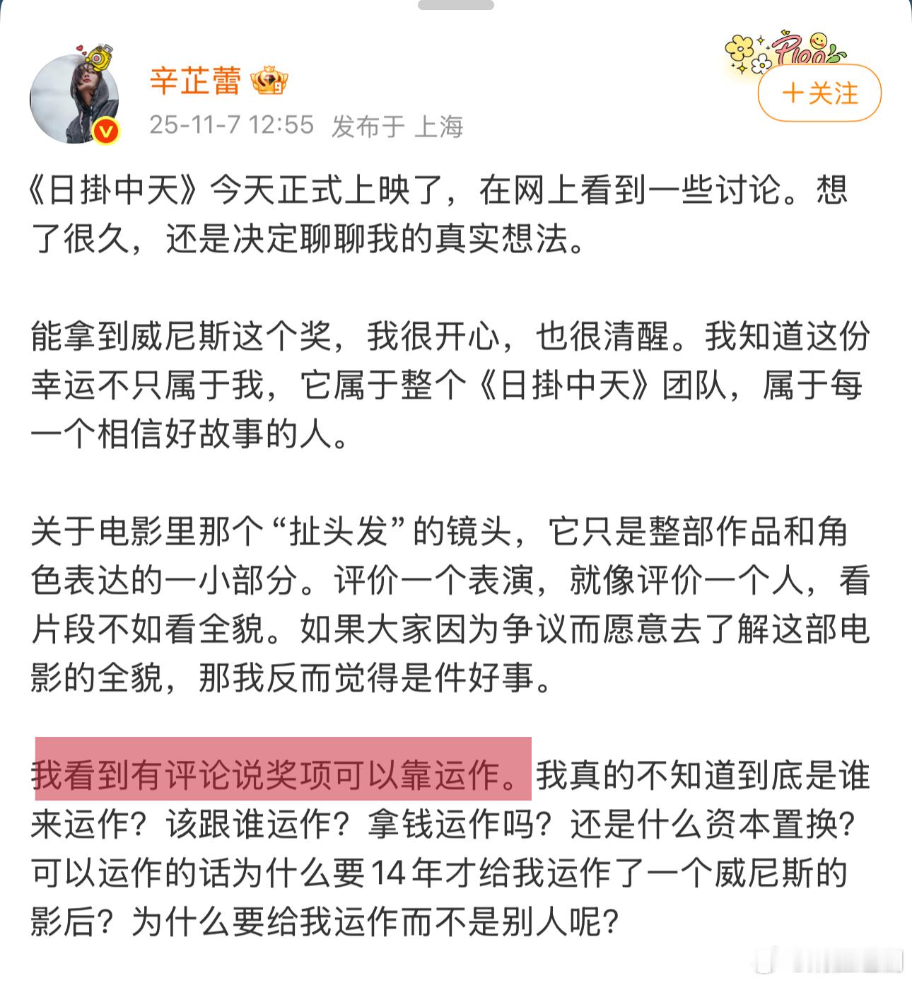 辛芷蕾 郝蕾情况不妙啊!威尼斯影后辛芷蕾获奖作品《日掛中天》今天上映众星包场宣传,排片接近20%但预测票房仅2900万。此前郝蕾朋友圈内涵,她今天六连问也回应奖项可以运作的质疑,呼吁和邀请观众走入电影院支持这部作品。