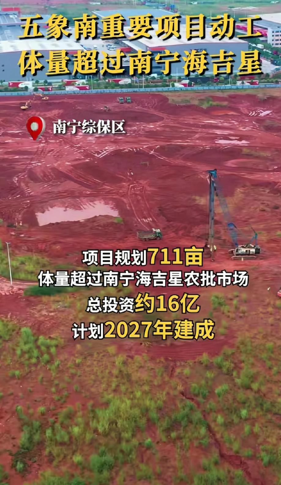 近期南宁五象南的一个重要项目——中国-东盟(南宁)水果交易中心已经开始动工。该项目规划面积711亩,体量超过南宁海吉星农批市场,总投资约16亿,计划2027年建成。项目将被打造为联动国内国际水果市场的流通核心枢纽,位于南宁综保区附近。(来源于@居南宁)