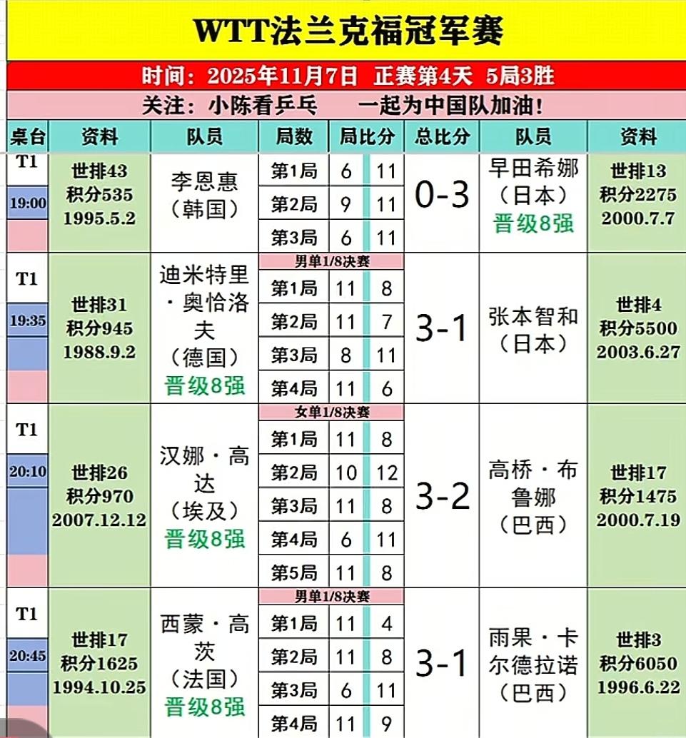 11月7日,法兰克福冠军赛,再有5人打进8强👍 ①早田希娜3-0李恩惠 早田轻松晋级,李恩惠全面溃败。 ②奥恰洛夫3-1张本智和 主场优势尽显,也算是爆了冷门。 ③汉娜·高达3-2布鲁纳 齐鼓相当,汉娜胜在有勇有谋。 ④西蒙·高茨3-1雨果 西蒙状态不错,布鲁纳邀约雨果一起回家。 ⑤伊藤美诚3-1波尔卡诺娃 比分11-9,8-11,11-5,11-8 下一轮,伊藤美诚VS韩莹。 感谢:小陈提供比赛详细成绩