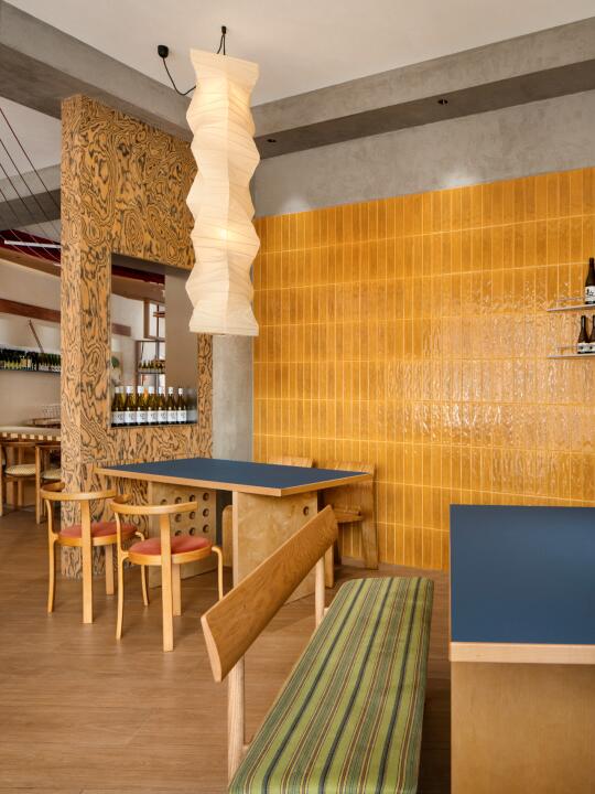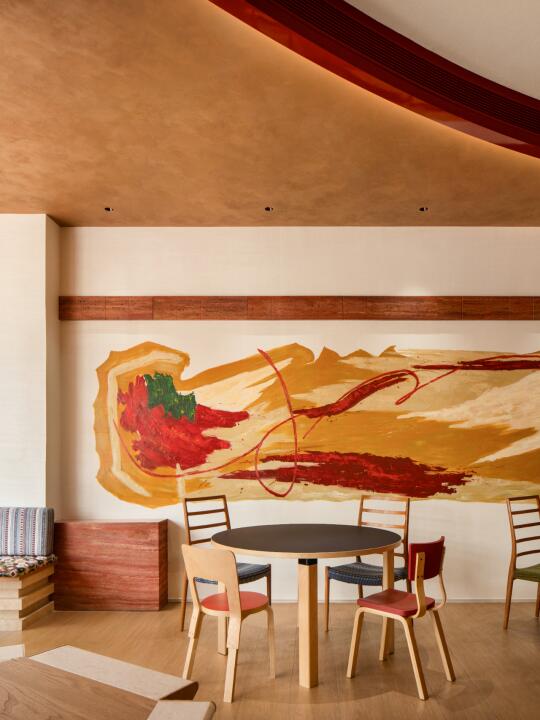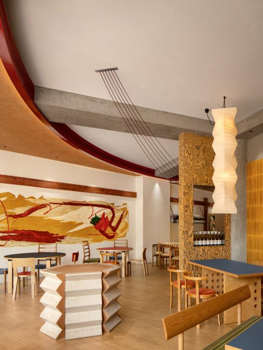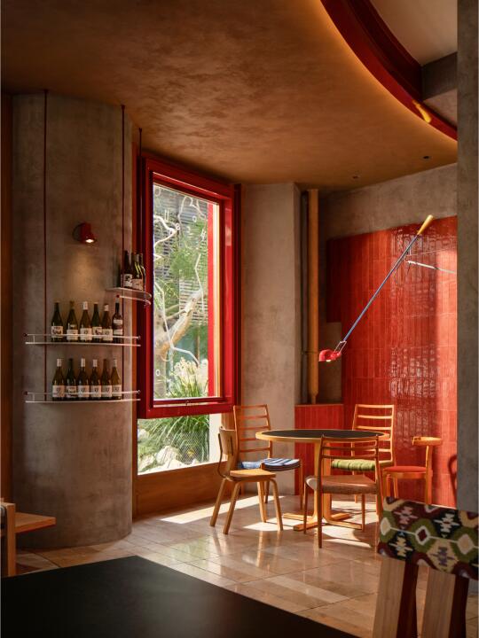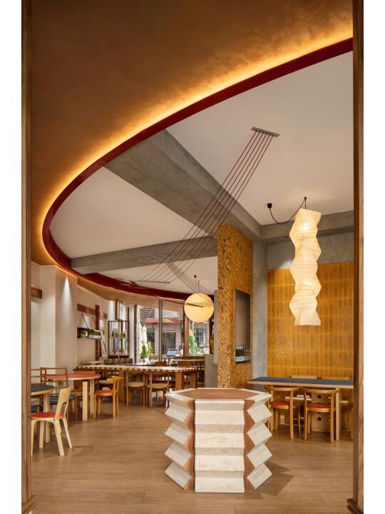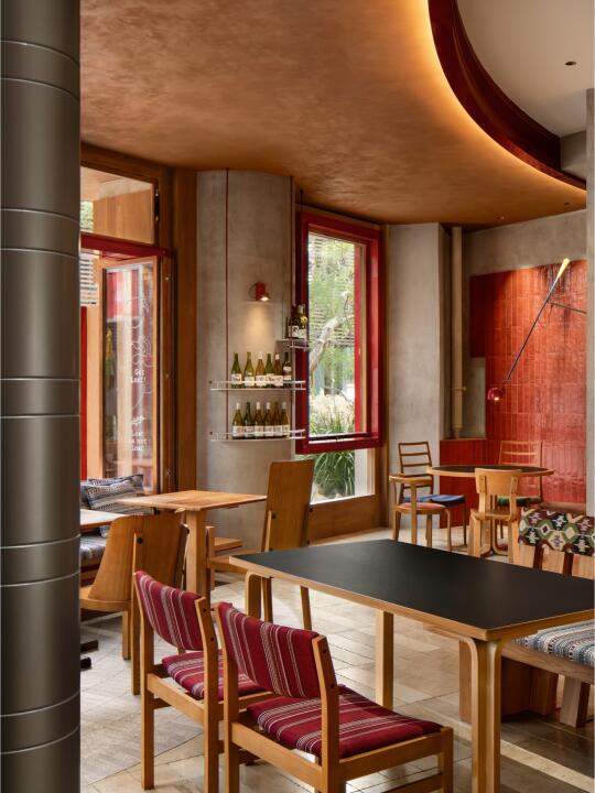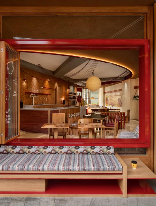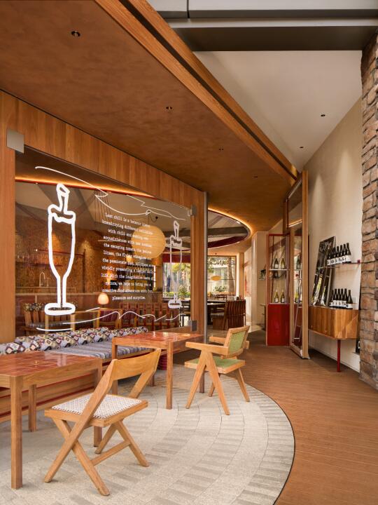 在设计初始的想法中,索拉设计希望空间中能有更多的自由与轻松感;外立面大小不一、高低起伏的红色窗口,被不同材质随意包裹的柱子,手绘在墙上的壁画,不满贴的手工砖,朴实的吧台,随处可见的酒瓶陈列,自然材质的使用,定制的手工挂毯等内容都是在对空间自由感的呼应使用。
