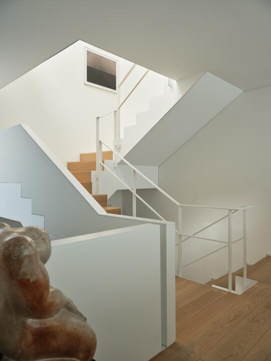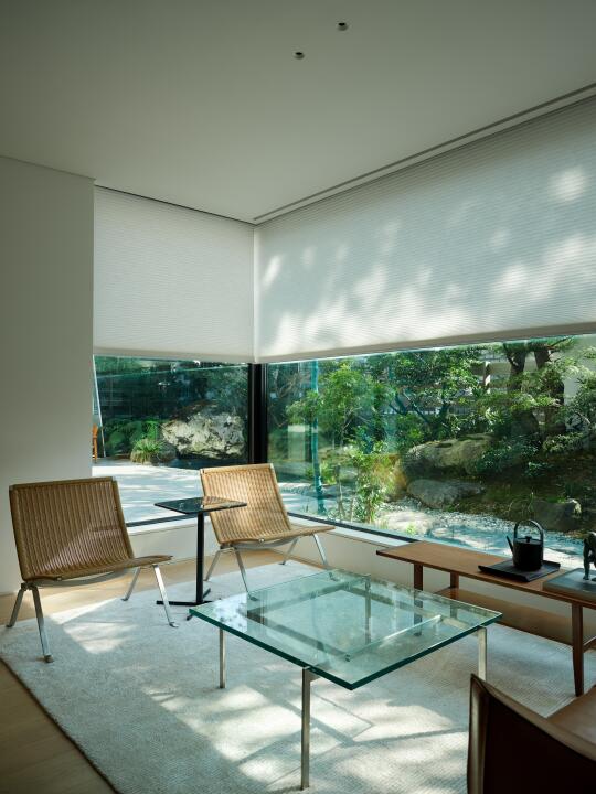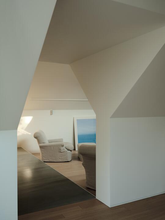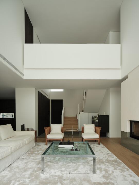用利落简约的线条、灰白色的基调,呈现一个永恒、平静、优雅的现代主义建筑。岩石作为低音,沉稳而厚重,见证着时间的流逝,也赋予空间永恒的质感。
