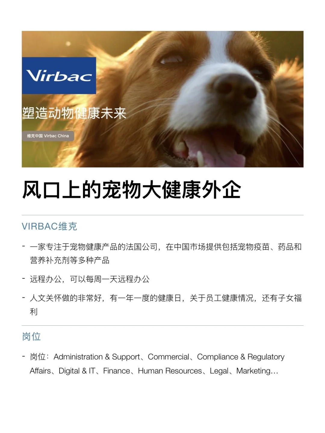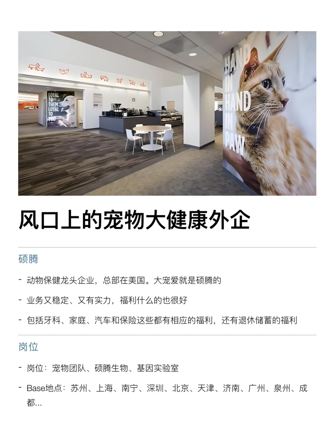 如果说宠物行业是黄金赛道,那宠物大健康更是宝藏赛道,不卷、高薪、前景好,图上都是全球顶尖的宠物医药/健康龙头,趁风口速速冲一波 . 🐈⬛养宠物的都把毛孩子当家人,健康是绝对的第一位,市场巨大而且正在疯狂增长 . ☑️外企普遍无996,年假15天+起步,弹性工作,每周有居家办公机会,六险一金顶格缴,补充医保覆盖全家,氛围包容,对女性友好,很好实现WLB . 坚持日更✊🏻,帮大家在找工作路上顺利拿到offer! .