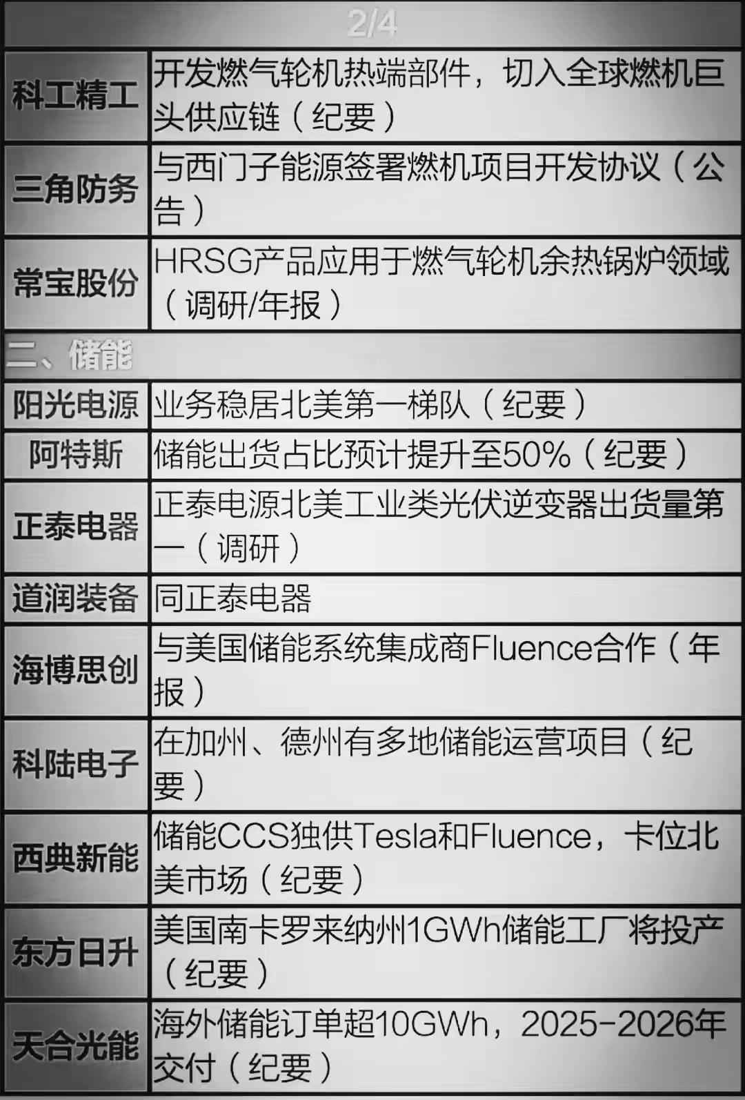 对中国A股上市公司在多个与AI电力、新能源及高端制造相关领域的业务布局与国际合作情况的系统梳理,共分为五个主要板块,分别是: 一、燃气轮机(第1张图) 聚焦国内A股上市公司在燃气轮机关键零部件制造与供应链合作方面的业务,主要合作伙伴包括国际巨头如GE(通用电气)、西门子、三菱、卡特彼勒等。 重点公司及动态: - 飞沃科技:为GE Vernova供应燃气轮机燃烧室钣金件及精密加工件。 - 航亚科技:向美国GE提供压气机叶片、压气机盘、涡轮盘等核心部件。 - 应流股份:国内燃机叶片龙头企业,与GE、西门子等深度合作。 - 万泽股份、航宇科技、博盈特焊、福鞍股份、豪迈科技、联德股份、隆达股份等:分别在高温合金、叶片、环锻件、燃烧系统、燃机制造基地、焊接组件、粉末材料等领域,为国际燃机厂商提供关键材料或部件,有的已进入北美或全球供应链体系。 👉 总结:该板块展现了中国企业在全球燃气轮机供应链中从零部件制造到材料供应的全面参与,尤其在高端精密加工和材料领域逐步实现国产替代和国际化。 二、储能(第2张图) 涵盖储能系统、光伏逆变器、储能电池及系统集成等领域,多家公司业务已进入北美等主流市场,部分企业处于行业领先地位。 重点公司及动态: - 阳光电源:北美储能业务稳居第一梯队。 - 阿特斯:储能出货占比预计提升至50%。 - 正泰电器 / 正泰电源:北美工业类光伏逆变器出货量第一。 - 海博思创、科陆电子、西典新能、东方日升、天合光能等:在北美有储能系统集成、运营项目、CCS(电芯连接系统)供应、储能工厂建设及海外订单等布局,部分直接与Tesla、Fluence等国际大厂合作。 👉 总结:中国储能企业正加速进入全球尤其是北美市场,在光伏逆变器、储能系统、电芯及连接方案等领域形成完整产业链布局,部分企业已成为细分领域隐形冠军。 三、AIDC(人工智能数据中心相关)、SOFC(固体氧化物燃料电池)、变压器/SST(固态变压器/中频变压器)(第3张图) 本部分分为三个子板块,聚焦服务于AI数据中心、新能源发电及电力调节的高端电力电子与基础设施领域。 1. AIDC相关(人工智能数据中心) - 思源电气:海外收入占约30%,北美订单2~3亿元。 - 冰轮环境:IDC(互联网数据中心)订单爆发,拥有美国/墨西哥工厂。 - 盛弘股份:布局数据中心用中压UPS、HVDC、SST电源方案。 - 宏发股份:继电器产品供货英伟达等AI算力基础设施核心客户。 2. SOFC(固体氧化物燃料电池) - 京泉华:为英伟达供应大型磁性元器件。 - 三环集团:为英伟达供应光模块。 - 振华股份:铬盐产品可用于SOFC燃料电池连接体。 - 雄韬股份、潍柴动力:在燃料电池系统及SOFC制造技术授权方面有布局。 3. 变压器/SST - 中国西电:具备固态变压器(SST)研发能力。 - 京泉华:专注SST系统中压中频变压器,已具备量产能力。 👉 总结:该板块凸显中国企业在服务AI数据中心、新能源及电力转换与控制的前沿技术领域的全球竞争力,部分企业已直接供货英伟达等AI算力基础设施巨头。 四、数据中心与电力传输设备(第4张图) 重点围绕数据中心供电与电力传输设备,特别是变压器、调相变压器、SST等相关产品在北美市场的应用与拓展。 重点公司及动态: - 金盘科技:绑定挪威Aker,间接对接微软、谷歌等国际数据中心订单。 - 伊戈尔:北美数据中心订单预期大幅上调。 - 保变电气:具备向北美出口大容量调相变压器的能力。 - 顺钠股份、特变电工、可立克、新特电气、华明装备等:涉及变压器、SST、整流及电力设备制造,部分产品已获北美市场准入或历史业绩。 其他领域: - 三星医疗:中标美国智能电表项目。 - 广信材料:绝缘材料获得西门子认证。 - 神马电力:复合绝缘子产品供应西门子、GE等全球电力设备龙头。 👉 总结:中国电力设备企业正深度参与全球数据中心与电网建设,特别是在变压器、智能电表、绝缘材料等关键产品上实现了国际认证和批量供货,部分企业已成为全球供应链中不可或缺的一环。 综合结论: 这四张图片合在一起,构成了一份较为全面的中国A股上市公司在AI电力、燃气轮机、储能、高端电力设备、数据中心供电系统等前沿和关键能源科技领域的业务布局图谱。主要体现出以下几个趋势和特点: 1. 国际化程度高:大量企业为国际巨头(如GE、西门子、三菱、英伟达、Tesla、Fluence等)提供核心零部件、材料或系统,业务覆盖北美、欧洲等重点市场。 2. 产业链完整:从燃气轮机零部件、储能系统、电力电子设备,到AI数据中心供电方案,中国企业已形成较完整的高端制造与能源科技产业链。