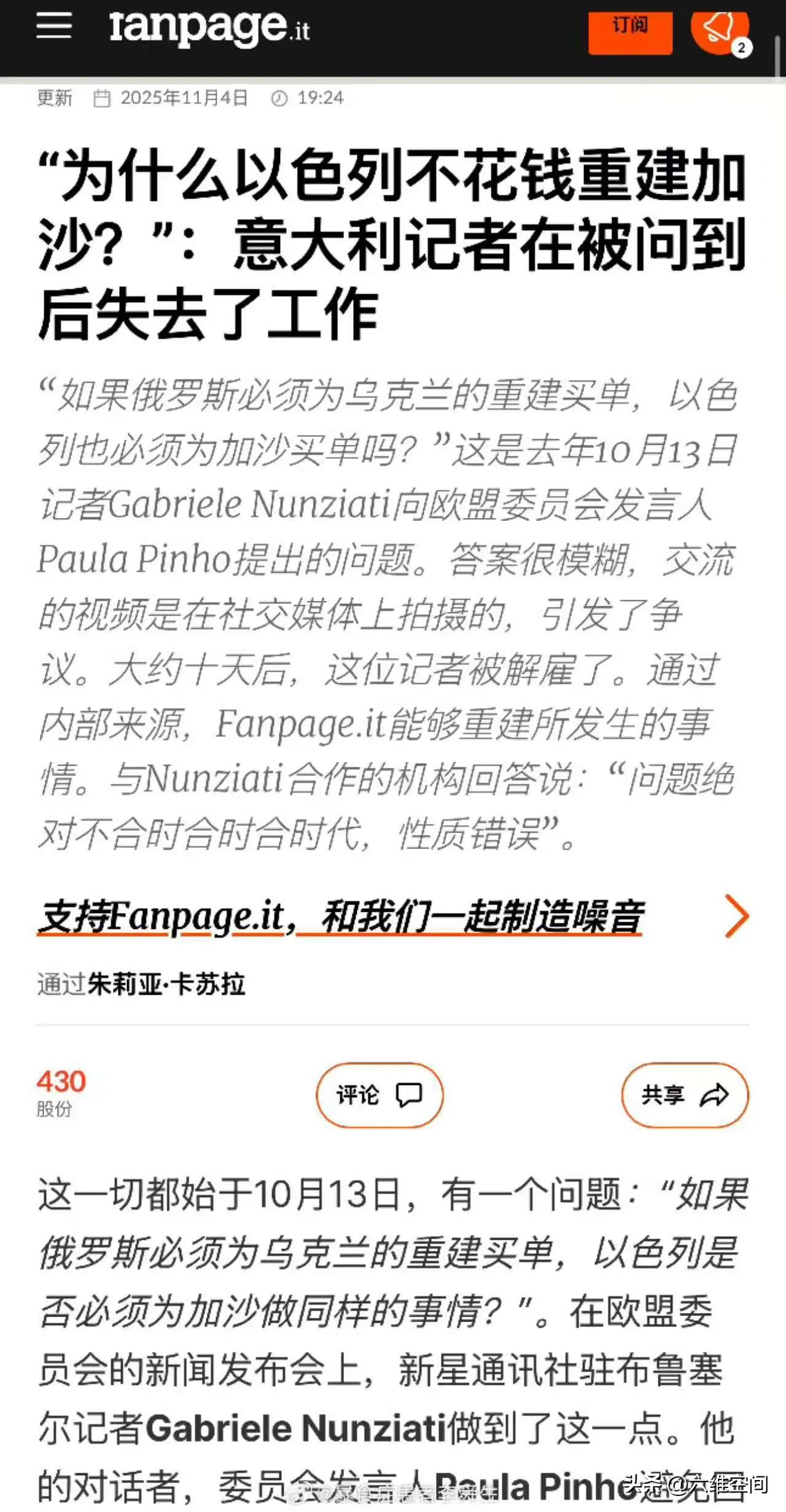 欧洲在新闻自由上双标成这样子,真的太不要脸了,一个意大利记者就问了一个问题,说欧洲要求俄罗斯承担乌克兰的重建费用,那以色列是不是应该承担加沙的重建费用,把欧洲的发言人问得哑口无言,不知道怎么回答,然后这个记者过几天就被开除了,给的开除理由是他问的问题不合时宜!这就是欧洲的所谓价值观,到今天欧洲还以为自己是教师爷,占据道德的制高点,其实最虚伪的就是欧洲了!