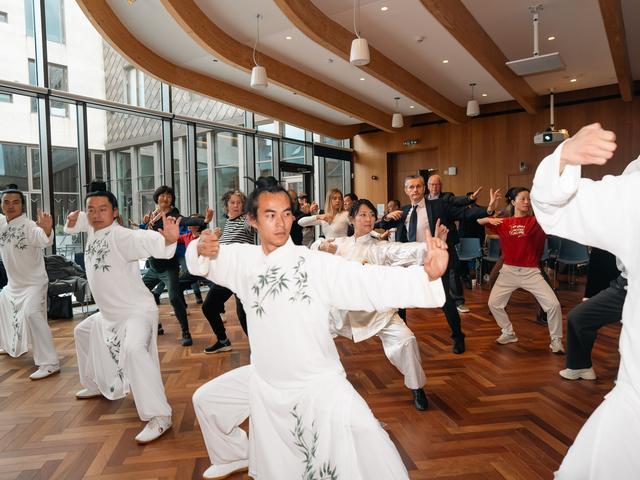呼吸调匀,双手一推,屈腿按掌。在4名武当太极传承人的引导和示范下,牛津课堂上数十名外国学员个个全神贯注,仿佛在这一刻大家穿越到了武当山。一招一式体验原汁原味的武当太极,这让英国马其顿社区协会主席西莫·波波夫斯基倍感亲切。在他看来,与朋友们一起探索中国艺术、茶文化和语言文学,是他所在的社区数十年来传承的一项优秀传统。