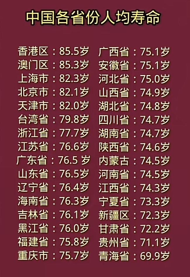 什么是决定你寿命的因素? 排名第一的比排名最后的多活15年,寿命长的都在发达地区。人均收入高,生活水平就高,就能获取营养丰富食物,加之生活环境优越,医疗保健水平高,文化娱乐活动所带来精神上的愉悦,所以能够长寿。而香港和澳门高高在上是还因为他们食品安全监管做得好,没有伪劣假冒食品。这样看来,经济发展程度和食品安全是长寿的决定因素。
