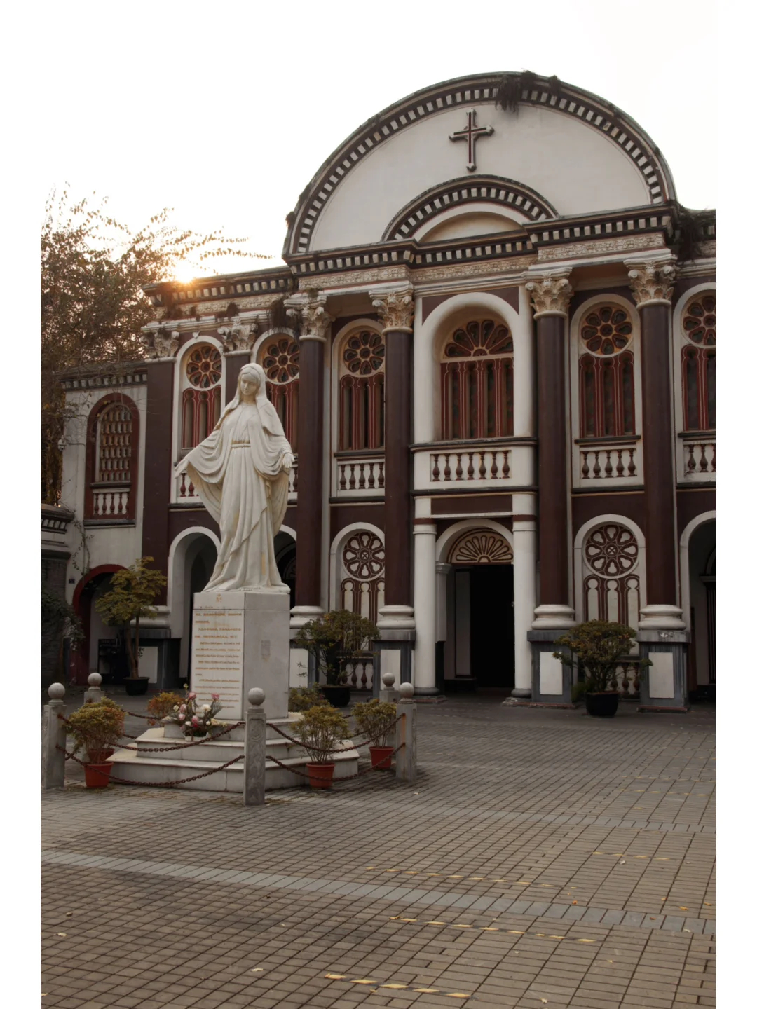 4️⃣整个教堂中西合璧,有中式的飞檐、天井、廊柱、瓦当、滴水,又有欧式的弧形穹顶、彩玻、拱型窗面。从空中俯瞰,整个教堂建筑群是一个“悚”字型。