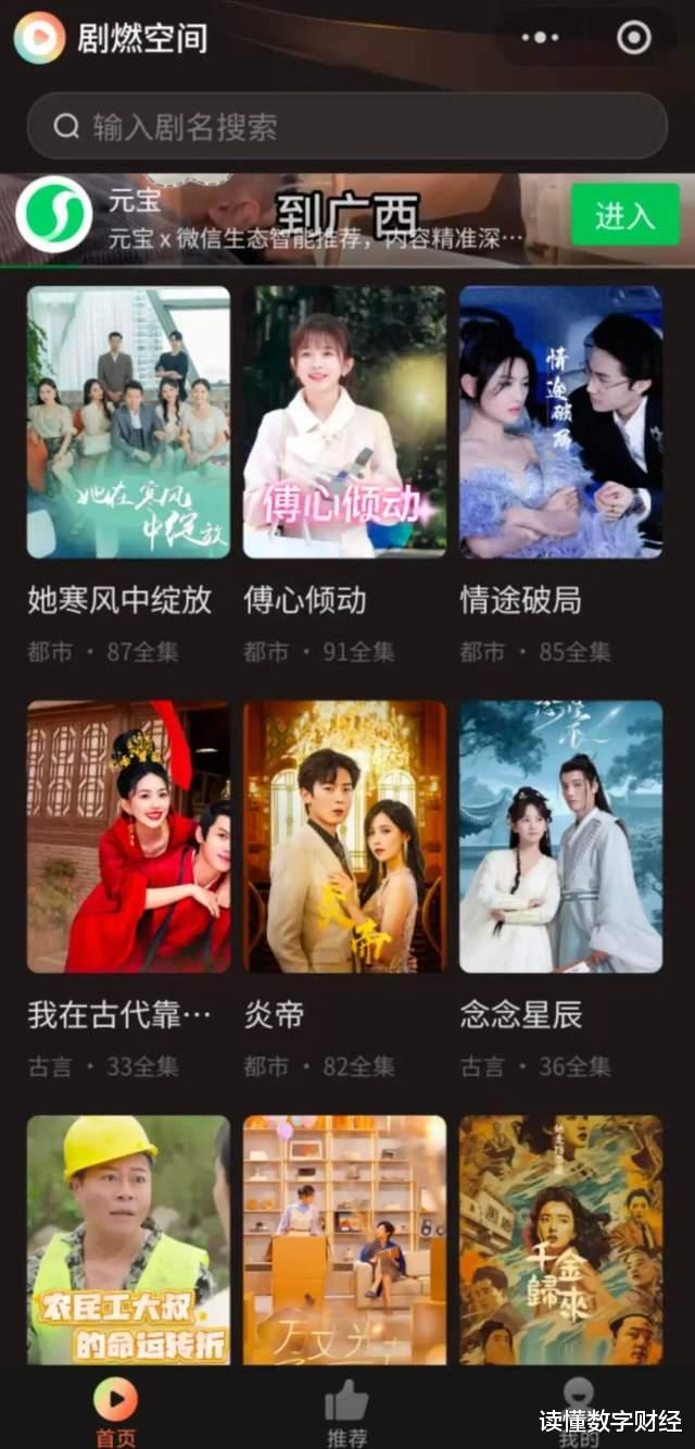 从“剧燃空间”小程序的实际体验来看,其产品设计高度贴合微信用户使用习惯,首页设置“推荐”“我的”等核心板块,提供“输入剧名搜索”功能,方便用户快速定位内容;剧集分类覆盖都市、古言等热门题材,如《她在寒风中绽放》、《情途破局》等,满足不同用户的情绪价值需求,不过上架的短剧内容不算太多。