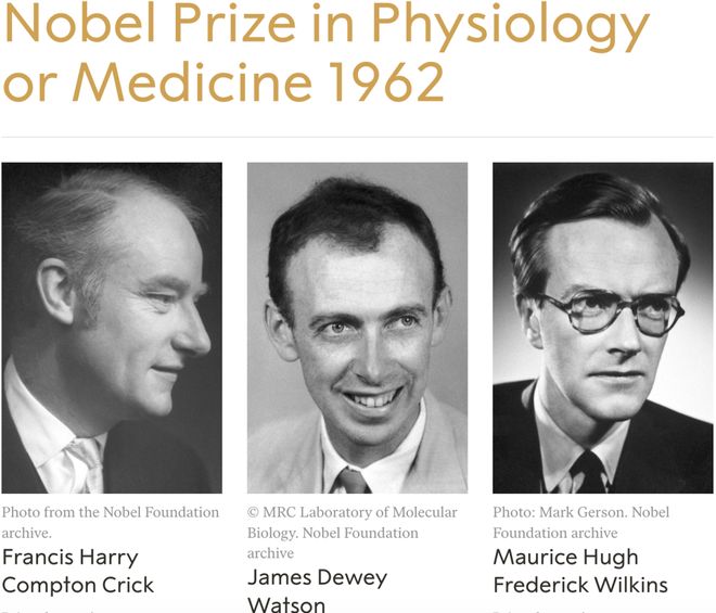 1962年,沃森、威尔金斯和克里克(此时已获博士学位)因这项工作共同荣获诺贝尔奖。