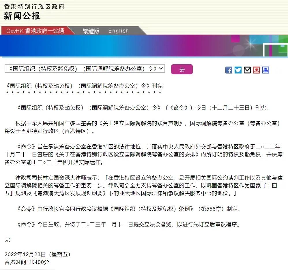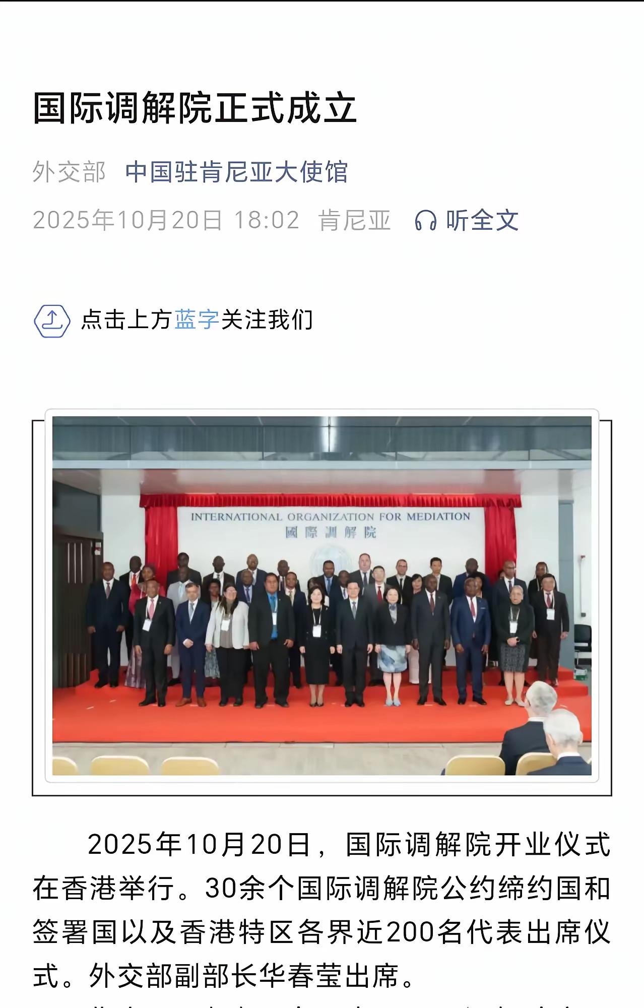 10月20日,在香港的国际调解院宣告正式成立并开始运作。国际调解院是全球首个专门致力于调解的政府间国际组织。用东方智慧调解世界矛盾,用诚心诚意造就世界和平。 热烈祝贺成立,有事就来调解。 心平气和沟通,莫要海牙判决。 大事小情都管,各方学会妥协。 试看今日寰宇,世界和平来也。