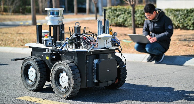 工程师在京津中关村科技城道路上对一款防爆轮式巡检机器人进行路测调试(2025年2月20日摄)孙凡越摄/