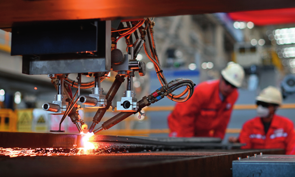 工作人员在海油工程天津智能制造基地制管作业车间调试数控切板机(2024年10月10日摄)赵子硕摄/