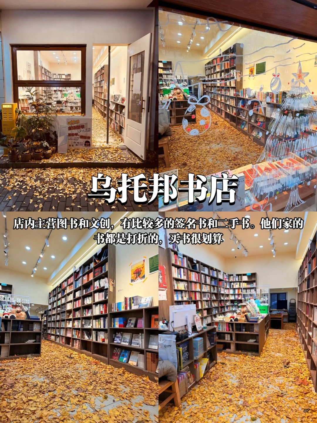 5️⃣乌托邦书店,满地银杏叶+满墙折扣书!主打签名书/二手书,价格比书店便宜一半,文创区的小摆件也很治愈(买了本绘本才10块!)
