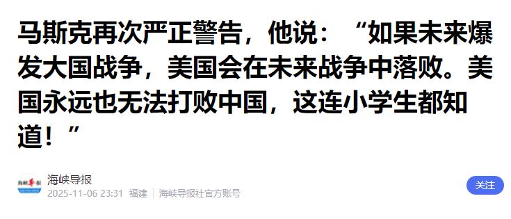 美国彻底坐不住了?马斯克再次严正警告,他说:“如果未来爆发大国战争,美国会在未来