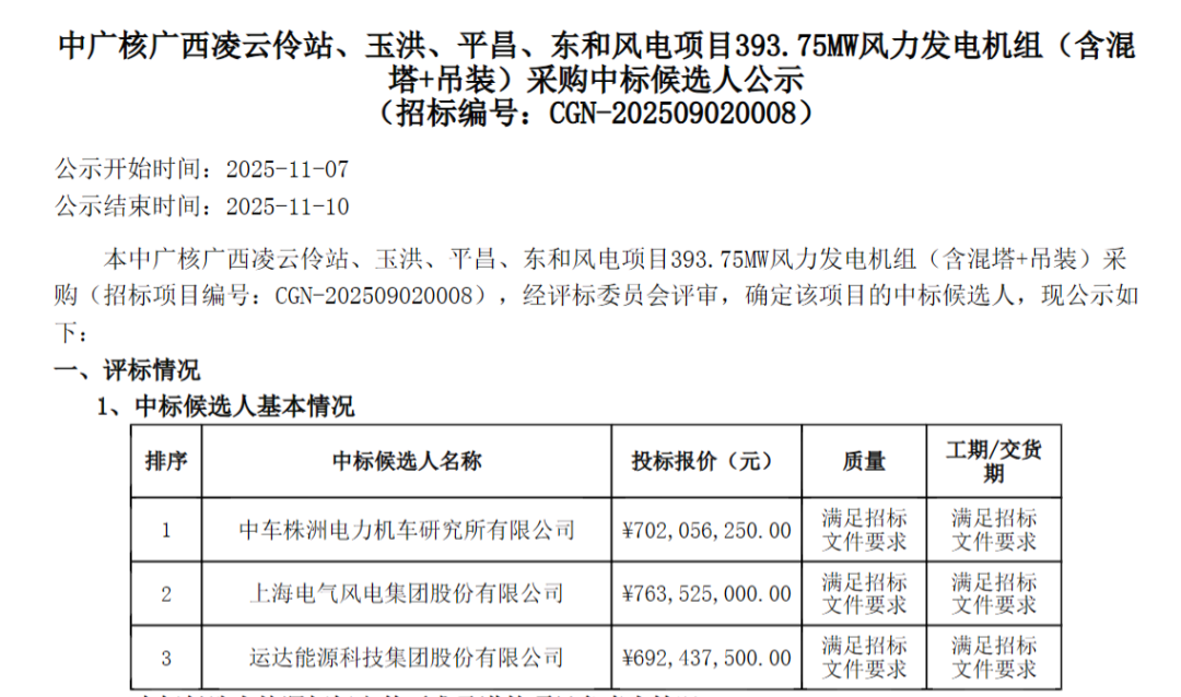11月7日,中广核电子商务平台发布《中广核广西凌云伶站、玉洪、平昌、东和风电项目393.75MW风力发电机组(含混塔+吊装)采购中标候选人公示》的公告。