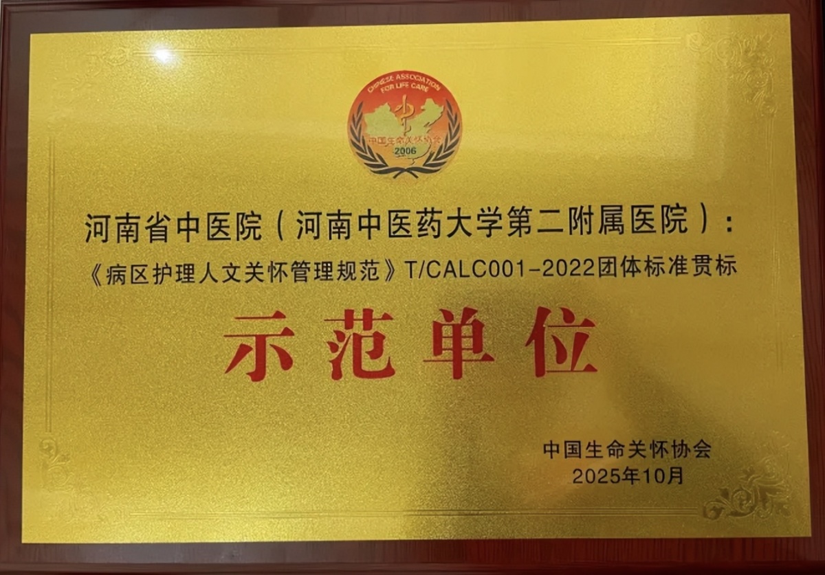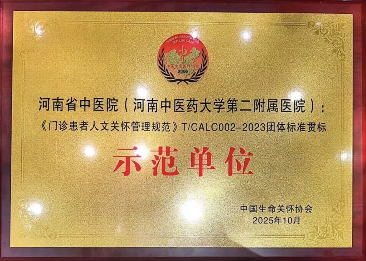 经综合评定,河南省中医院荣获以下四项重要荣誉:《病区护理人文关怀管理规范》T/CALC001-2022团体标准贯标“全国首批示范单位”、《门诊患者人文关怀管理规范》T/CALC002-2023团体标准贯标“全国首批示范单位”、《手术室患者人文关怀管理规范》T/CALC003-2023、《卒中单元住院患者人文关怀护理规范》团体标准贯标达标单位四项荣誉称号。