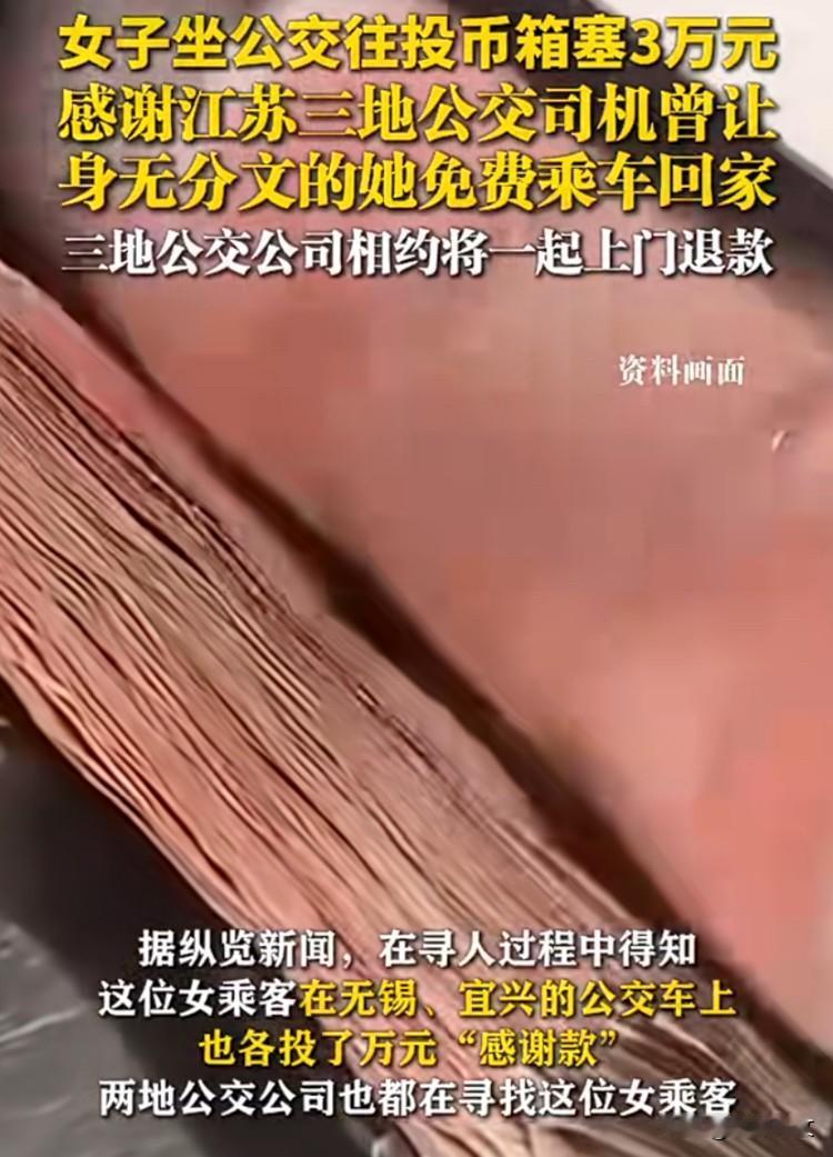 “活该她挣到钱!”江苏常州,一阿姨乘公交车刷了卡后,竟然从包里掏出一沓钱,毫不犹豫地将钱塞进投币箱里。一旁的公交车司机顿时傻眼了! 视频中,阿姨上了公交车后先是刷了卡,随后又从包里拿出了一沓红色的现金,眼睛不带眨,手不带抖地将现金一点一点地塞进投币箱里。 此举让一旁的司机当场呆住了。 随后,反应过来的司机想要阻止她,没想到阿姨的态度坚决,将捆起来的一沓钱全都投进了投币箱里。 一共一万元! 常州公交公司全网寻找这位阿姨,希望能将这笔巨款退还。 没想到在寻人过程中,竟发现这位阿姨在无锡、宜兴的公交车上也各投了万元现金。 这到底是怎么回事呢? 经过三地公交公司的不懈努力,终于找到了阿姨的下落。 对此,阿姨也道明了原因,原来她是为了报答三地公交车曾让身无分文的她免费乘车回家。 现在三地公交公司相约要一起上门还款,希望阿姨一定要收回这笔沉甸甸的“车费”。 真是满满的正能量,这位阿姨是个知恩图报的人。这个世界还是有真情存在的。 最重要的一点就是,这个阿姨生活水平提高了,这是好人最好的消息!