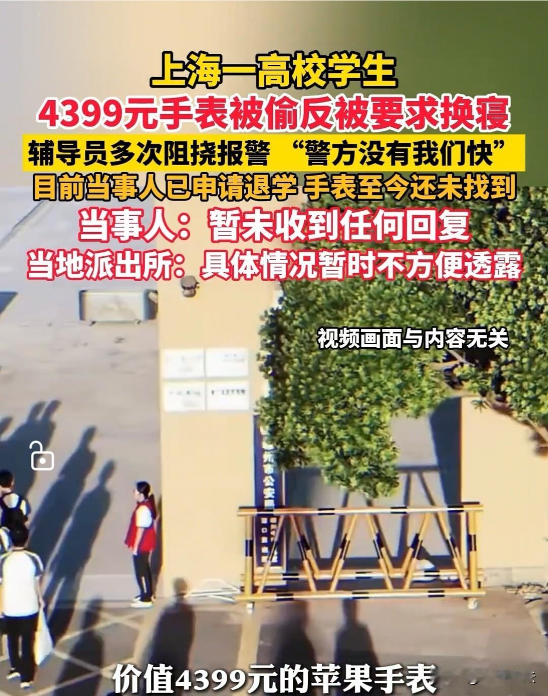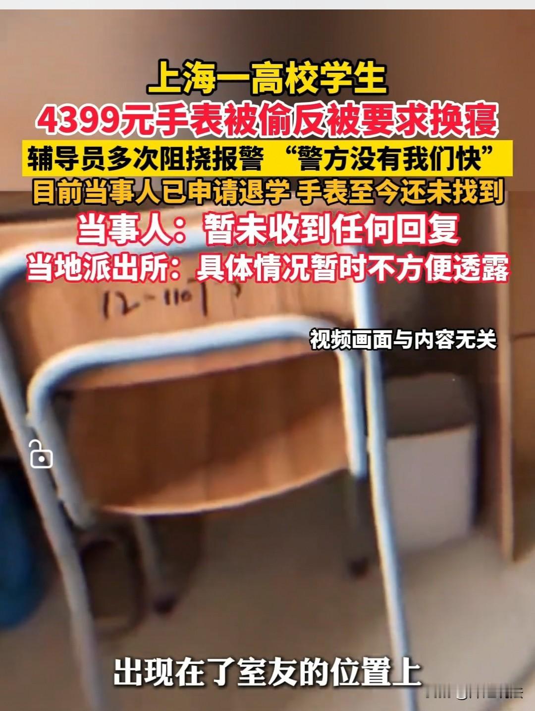 上海,女生4399元的手表被偷,她定位到了室友的位置上。她要求对方搬离寝室,可辅导员却不让,还让她搬离即可。女生觉得不合理,想报警,但辅导员表示:“警察没有我们快。” 随后,辅导员还要求其他室友一起把寝室的电断掉,逼迫女生搬走。现在女生已经申请退学,而民警对于该事件的情况给出的答复是:暂时不便透露。 女生发现自己4399元的手表丢了,就在思索到底在哪里丢的,最后她确定是在寝室里丢的,绝对不可能丢在外面。 有了这个判断后,她瞬间想到会不会是被室友偷走了,赶紧根据定位查找手表的踪迹,结果定位最后一次出现在室友的位置。 女生直接找到辅导员,说明了情况,并想让该室友搬离寝室,认为对方手脚不干净。 可辅导员却觉得没有实证,不能随便冤枉人,不同意女生的要求,还让女生自行搬离寝室:“她们几个相处得挺好的,你在这里面扰乱氛围,那你搬走吧。” 女生觉得难以置信:“我的手表有定位功能,我自己清楚定位的准确性,既然定位在某室友的位置,那她就是重大嫌疑人,要求她搬走,不为过吧?为什么辅导员不调查反而要自己搬走?这不是颠倒黑白吗?”女生就想报警。 可是辅导员直接来了一句:“你报警没用,警察没有我们快。” 女生更是气愤了:“哪有这样的老师呀?你得公平起见呀!你说我冤枉人,那就准许我检查他们的东西,看看到底冤没冤枉人。” 可是辅导员直接要求她搬离,在女生不搬离的情况下,直接让其他女生一起搬走,随后把该寝室的电给断了。 这样一来,就迫使女生没法正常居住,连进进出出都不方便。她觉得完全受到了人格侮辱,还是直接报了警。 她做好了退学的决定,即便不上学,也要为自己伸张正义。 最后,辅导员得知她报警后,还打电话来质问她、指责她。 但是女生并没有害怕,她觉得自己就是要一个真相、一个公道,自己没有犯错,为什么要被大家排挤? 校方得知情况后,承诺会依法依规处理这件事,而辖区的民警也表示,此事正在调查之中,具体情况不便透露。 不过网友们有些困惑:辅导员为什么要这么做?女生说的到底是不是实情?定位是不是准确? 虽然这些都是疑问,但是大家更不明白的是,即便女生的定位存疑,辅导员也应该协助调查清楚呀,即使是内部处理也没关系,总之得将这件事搞清楚才是首要任务吧。 那么,辅导员为什么要这样对待女生?他是不是自身也有问题?这些不应该仅凭猜测,可能真的还得等待后续的公告,才知道事情的来龙去脉。 一、女生价值4399元的手表丢失,虽然定位显示在室友位置,但需警方进一步核查,才能最终认定责任。 《刑法》第二百六十四条(盗窃罪):盗窃公私财物,数额较大的,或者多次盗窃、入户盗窃、携带凶器盗窃、扒窃的,处三年以下有期徒刑、拘役或者管制,并处或者单处罚金;数额巨大或者有其他严重情节的,处三年以上十年以下有期徒刑,并处罚金。 本事件中,定位为线索,需警方核实;若属实且室友具盗窃故意,4399元达盗窃罪“数额较大”,需担刑责。 二、辅导员以断电、要求搬离等方式逼迫女生,且阻挠其报警,该行为属于变相限制女生正常居住权利。 《治安管理处罚法》第四十条:有下列行为之一的,处十日以上十五日以下拘留,并处五百元以上一千元以下罚款;情节较轻的,处五日以上十日以下拘留,并处二百元以上五百元以下罚款:(三)非法限制他人人身自由、非法侵入他人住宅或者非法搜查他人身体的。 本事件中,辅导员行为违法,涉嫌侵扰居住安宁、阻挠合法维权,可能面临治安处罚。 三、女生因被逼迫而申请退学,可依据现有事实主张自身合法权益,要求校方承担责任。 《教育法》第四十三条:受教育者享有下列权利:(四)对学校给予的处分不服向有关部门提出申诉,对学校、教师侵犯其人身权、财产权等合法权益,提出申诉或者依法提起诉讼。 本事件中,女生可凭证据向学校申诉或起诉,要求校方纠正不当行为、承担侵权责任。 对于此事,大家如何看待呢? 素材来源于,美丽浙江2025年11月8日