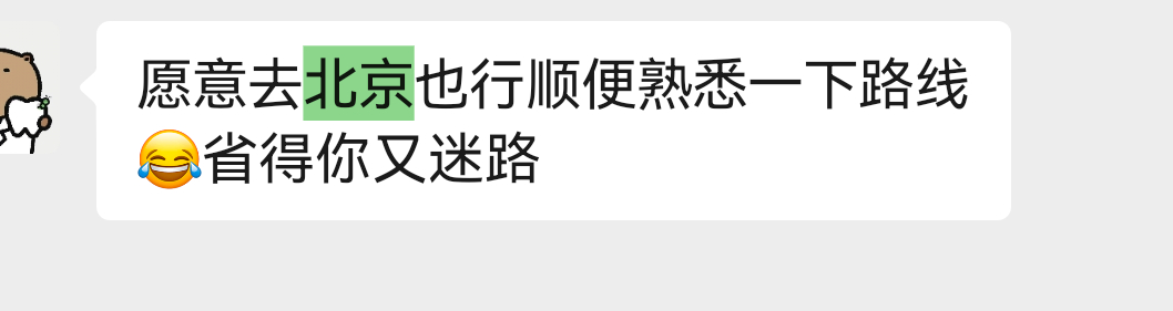 突然想到一个问题,我不会15号在北京迷路吧~说起来都觉得自己好笑,孩子9月份升学换了一个学校,离家也不太远,每天接送,我在迷路了n次,各种导航的情况,终于在10月份走对了路。。室友也是辛苦了,跟我操碎了心,说让我提前去北京熟悉路[挖鼻]