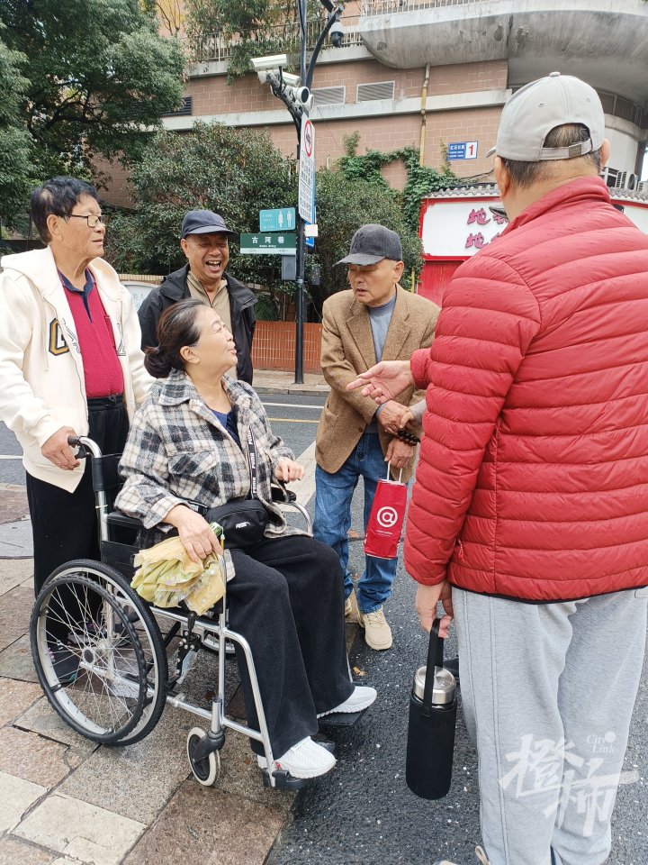 王丽妹坐轮椅刚到一群老邻居围上来聊天
