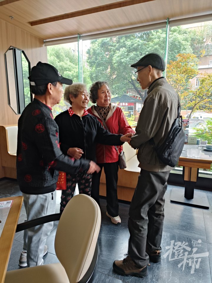 11月8日上午,小车桥、性存路、余庆里的85位老邻居们在东大方潮王路店欢聚,这些老邻居最大的86岁,最小的67岁,平均年龄在70岁以上,有的分别时还是少年,再见面已是古稀。阔别56年没见面的老邻居,坐着轮椅来相见,一见面都是握手、问候、唠家常,围在一起笑逐颜开。
