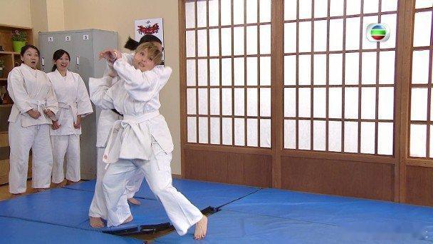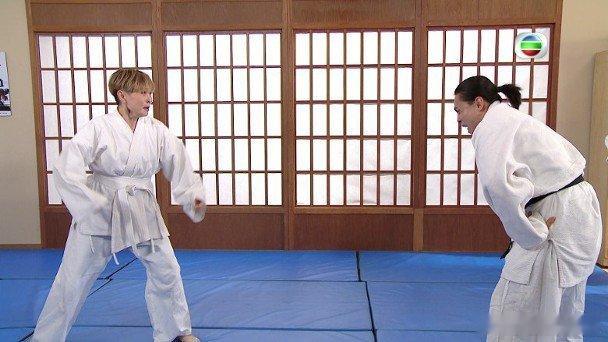 無綫處境劇《愛‧回家之開心速遞》,昨晚絕對是湯盈盈形象大改變的一集。平時以「「尋寶圖總監」身份的清爽造型演出,今次她為鼓勵飾演「熊樹仁」的單立文做運動,親身披上柔道服大展身手,無論是「掃腿」、「摔撻」、「受身」等動作皆入型入格,甚有「女中豪傑」味道。