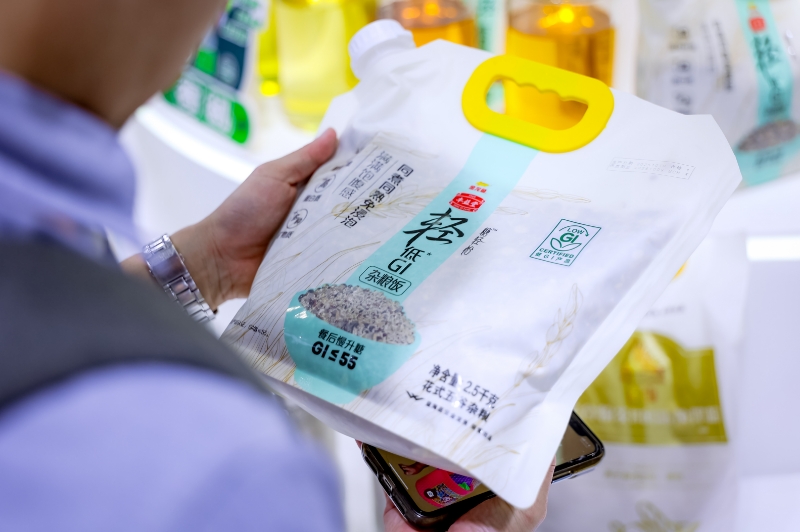 在大米展区,消费者正在扫码,了解手中这袋大米的“前世今生”。这就是益海嘉里金龙鱼的“一码溯源”,直击大米从农田到餐桌的全过程。