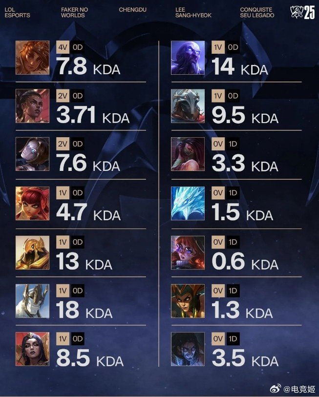 今日赛事官方统计Faker S15使用不同英雄KDA数据,其中加里奥、瑞兹、沙皇位列前三。